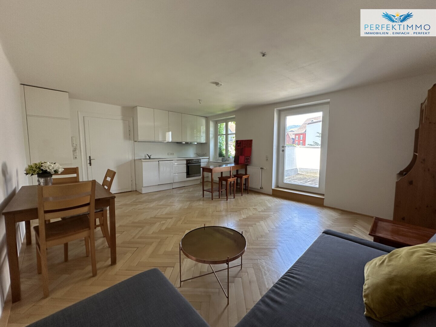 Die hochwertig sanierte Wohnung Top 5 im 1. Obergeschoss bietet rund 59,51 m² Wohnfläche sowie eine sonnige Terrasse mit ca. 37 m². Die Holzlatten werden in den nächsten Tagen durch großflächige Fliesen ausgetauscht, sodass die Terrasse in neuem Glanz erstrahlt. WC und Badezimmer sind getrennt angelegt. Für einen Altbau typisch, verleihen edle Parkettböden den Räumen eine warme Atmosphäre. In Richtung Straße sorgen hochwertige Schallschutzfenster für Ruhe.