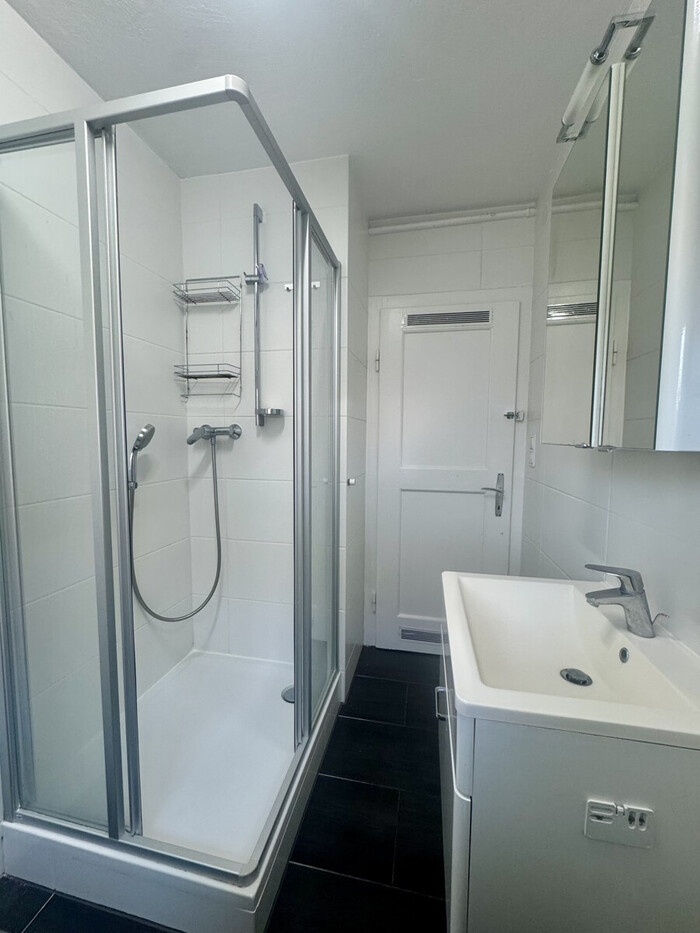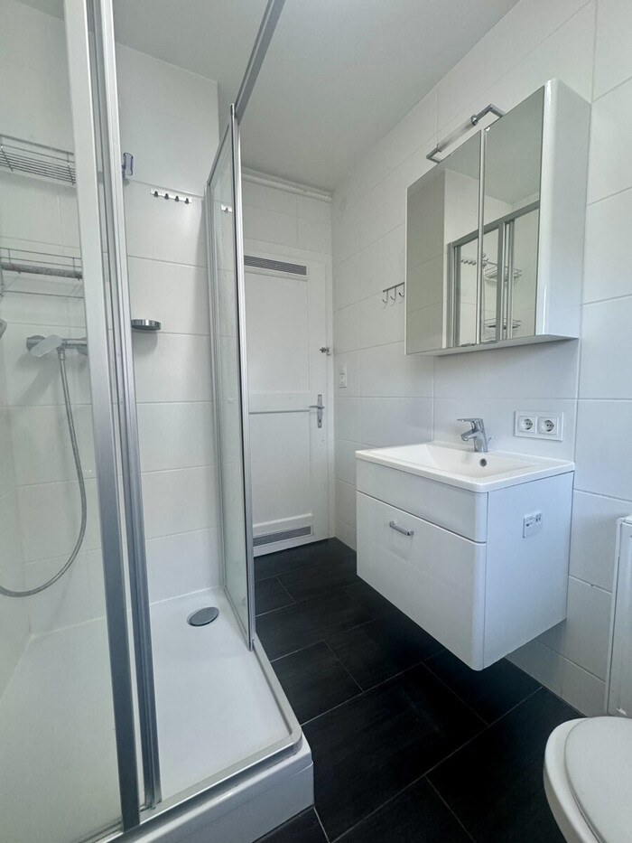 Das Badezimmer mit Fenster verfügt über eine Dusche und ein WC. Zudem sind Anschlüsse für Waschmaschine und Trockner vorhanden. Ergänzend dazu steht den Bewohnern ein gemeinschaftlicher Wasch- und Trockenraum in der Wohnanlage zur Verfügung.