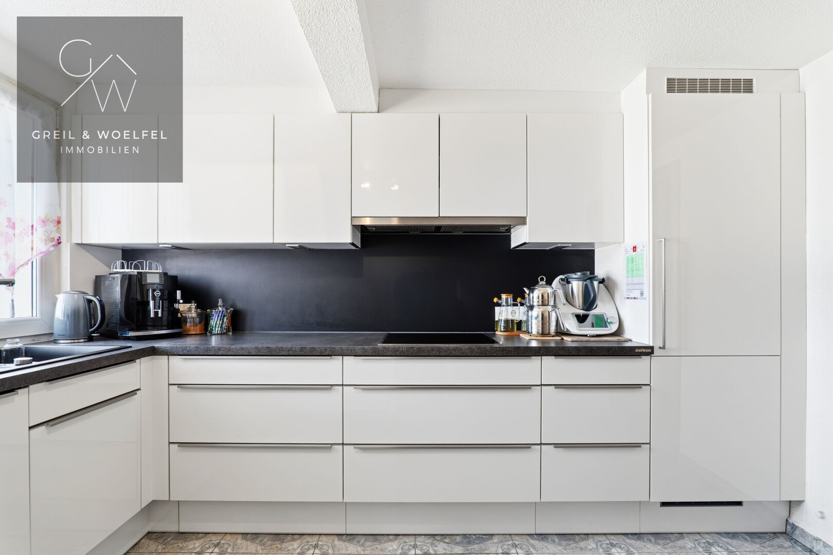 Die Wohnung verfügt über insgesamt fünf Zimmer, davon vier gut geschnittene Schlafzimmer sowie zwei Badezimmer – eine ideale Aufteilung für den Alltag mit mehreren Personen, Gäste oder Arbeiten von zu Hause. Die vorhandene Einbauküche ist funktional integriert und bietet eine solide Basis für den täglichen Gebrauch.