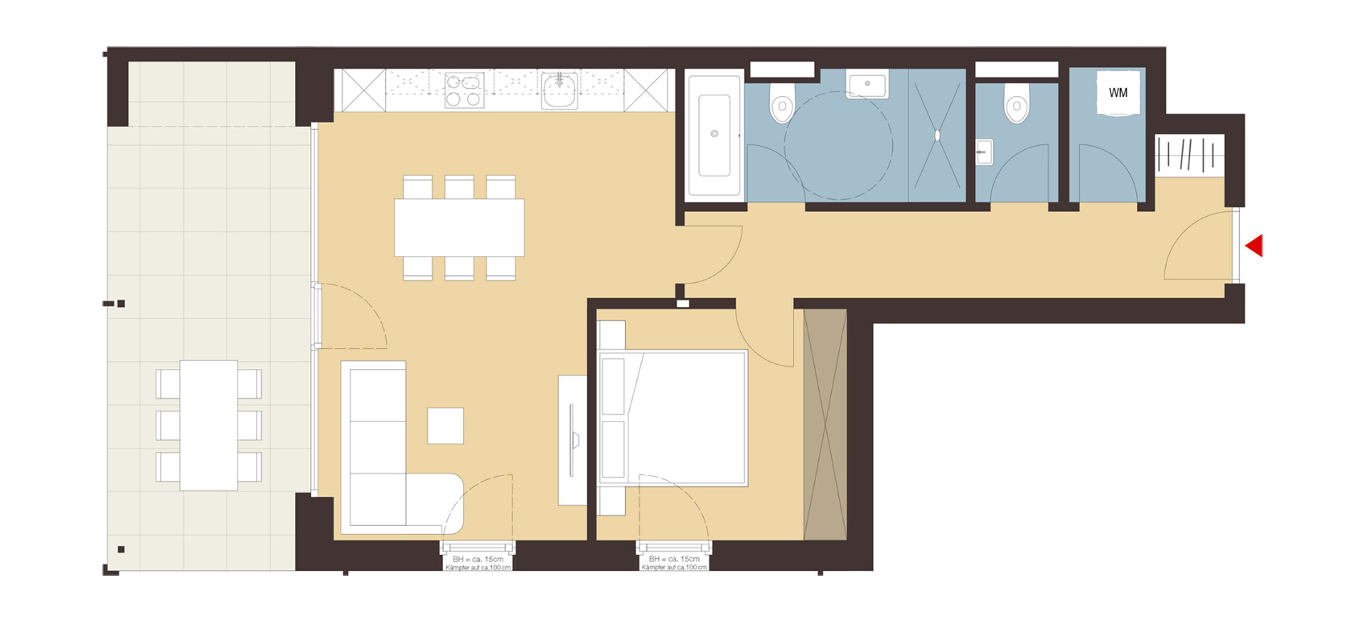 Ein durchgängig offener Wohnbereich und ein separates Schlafzimmer bieten eine ideale Raumaufteilung für eine oder zwei Personen. Die Terrasse ist direkt vom Wohnbereich aus zugänglich und erweitert den Wohnraum ins Freie.