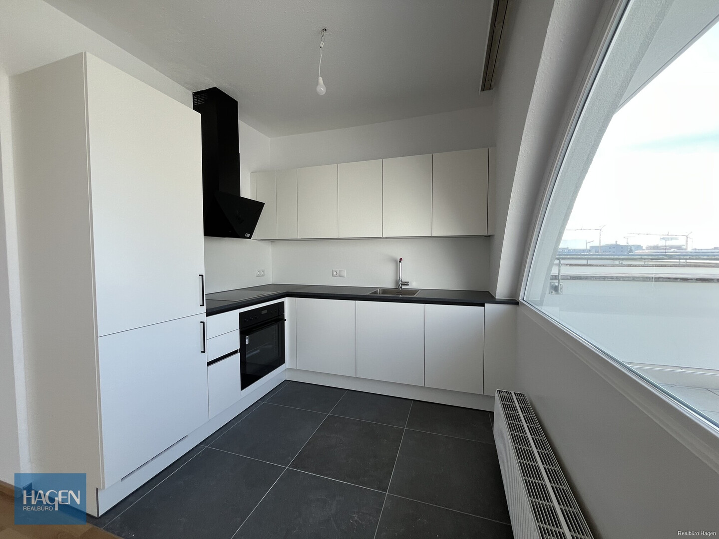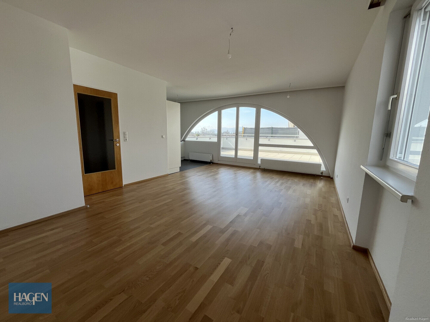 Das Highlight der Wohnung ist die großzügige Terrasse mit traumhaftem Panorama. Die einzigartige, bogenförmige Fensterfläche öffnet den lichtdurchfluteten Wohn-Essbereich zur Terrasse hin und schafft ein außergewöhnliches Wohnambiente mit viel Helligkeit und architektonischem Flair.