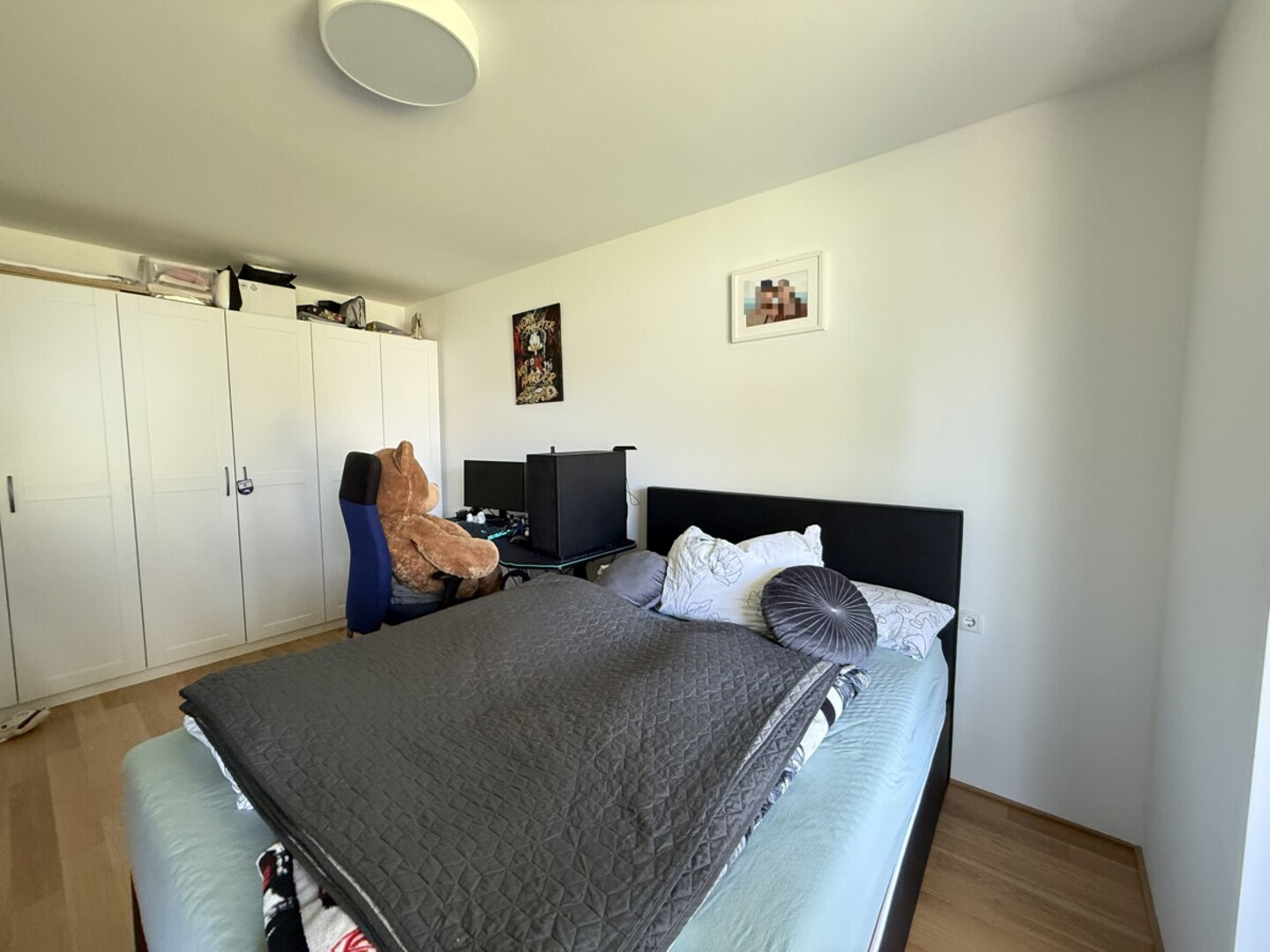 Das Schlafzimmer bietet ausreichend Platz für eine gemütliche Einrichtung und einen ruhigen Rückzugsort. Das modern ausgestattete Badezimmer fügt sich harmonisch in das Gesamtbild ein.