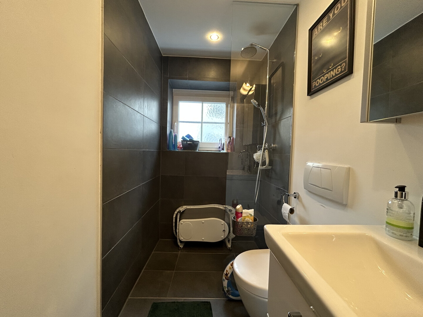 Das Badezimmer verfügt über ein Waschbecken mit Spiegelschrank, einem WC und einer tollen Dusche.