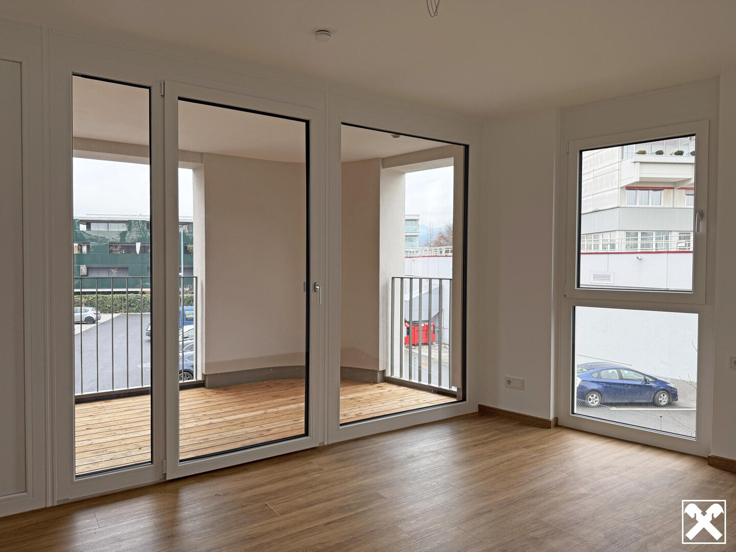 Große Familienwohnung im 1. OG: zwei Schlafzimmer, offener Wohn Essbereich und ein außergewöhnlich großzügiger Balkon mit ca. 14 m. Ideal für alle, die viel Außenfläche und Wohnkomfort wünschen