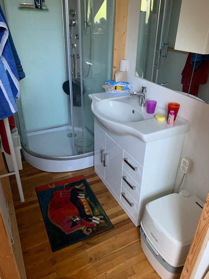 Das Innere des Hauses besticht durch seine gemütliche Atmosphäre und die geschmackvolle Einrichtung. Der offene Grundriss schafft ein helles und luftiges Ambiente, während die modernen Annehmlichkeiten für Komfort sorgen. Das Schlafzimmer bietet ausreichend Platz und Ruhe, während das Badezimmer mit hochwertigen Armaturen ausgestattet ist.