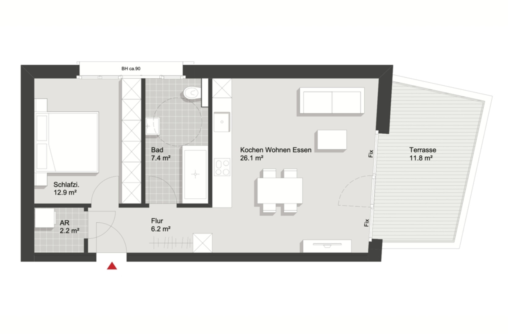 Die Wohnung ist aufgeteilt in einen Gang, Abstellraum, Schlafzimmer, Bad mit Dusche