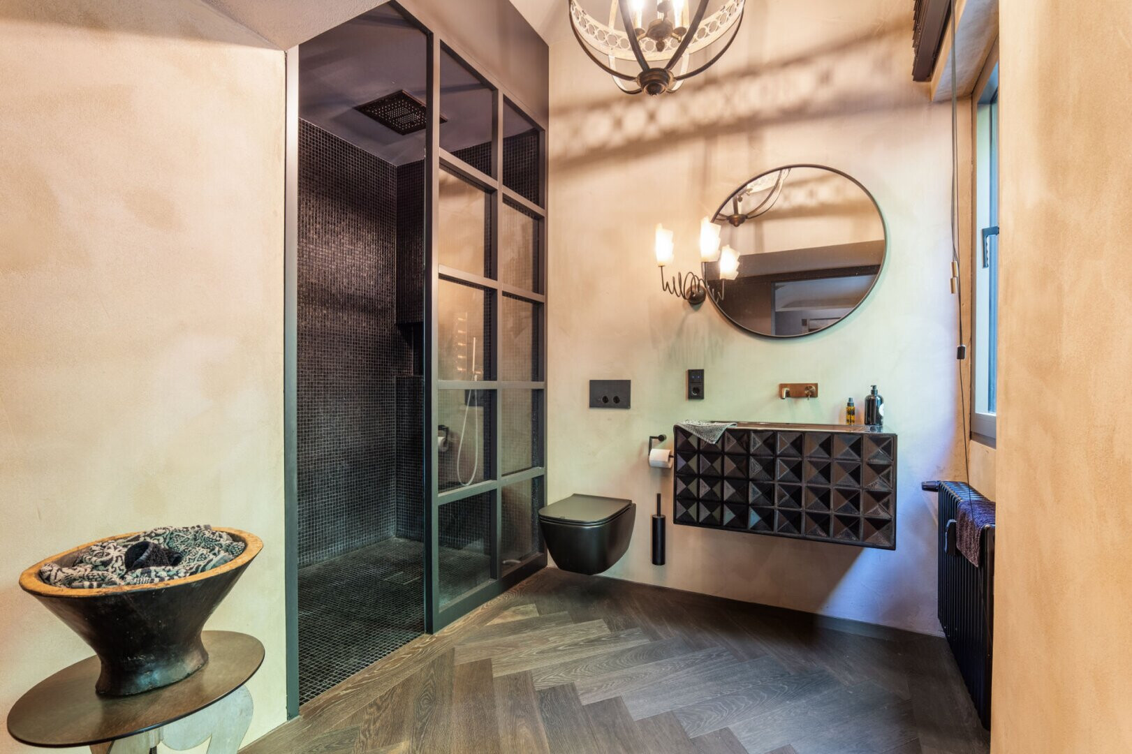 Angefangen vom dunklen und Gemütlichkeit erschaffenden Fischgrätparkett, der im ganzen Objekt verlegt wurde bis zu den Platanen, die im Sommer die herrliche Terrasse vor der Sonne schützen, alles unterlag dem Aspekt des ästhetischen Anspruchs und des Gesamtkunstwerks.