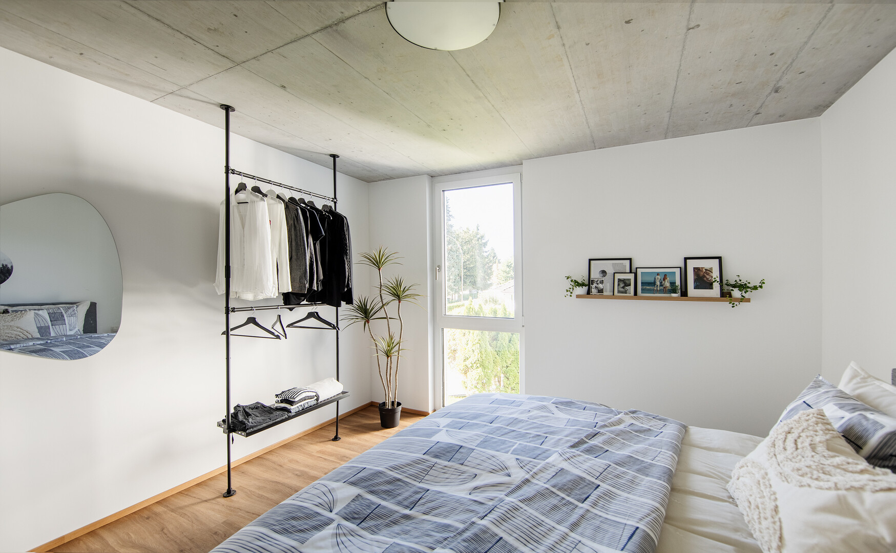 Raumhohe Fenster, sichtbare Betonelemente und ein reduzierter, zeitloser Materialmix prägen das Erscheinungsbild. Helle Räume, klare Linien und funktionale Grundrisse schaffen ein Wohngefühl, das sowohl im Alltag als auch langfristig überzeugt.
