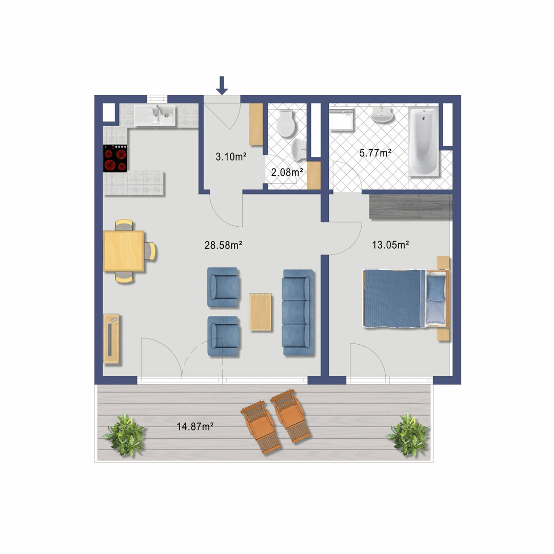 Die Wohnung verfügt über einen großzügigen Eingangsbereich und ein separates WC. Der offene, sehr helle Wohn- und Essbereich sorgt für eine angenehme Atmosphäre, während der angrenzende Küchenbereich darauf wartet, nach den eigenen Wünschen vom Käufer gestaltet zu werden. Auch das Badezimmer ist geräumig und mit einer Badewanne ausgestattet.