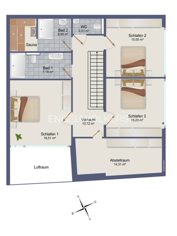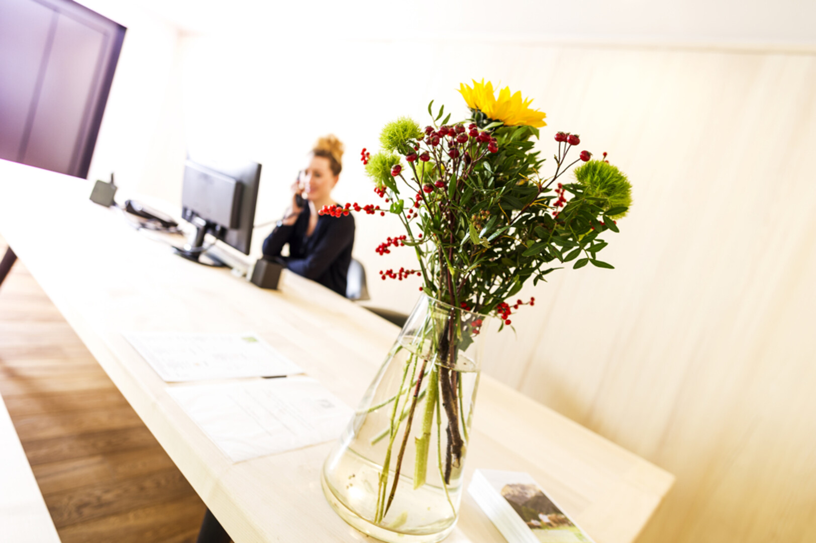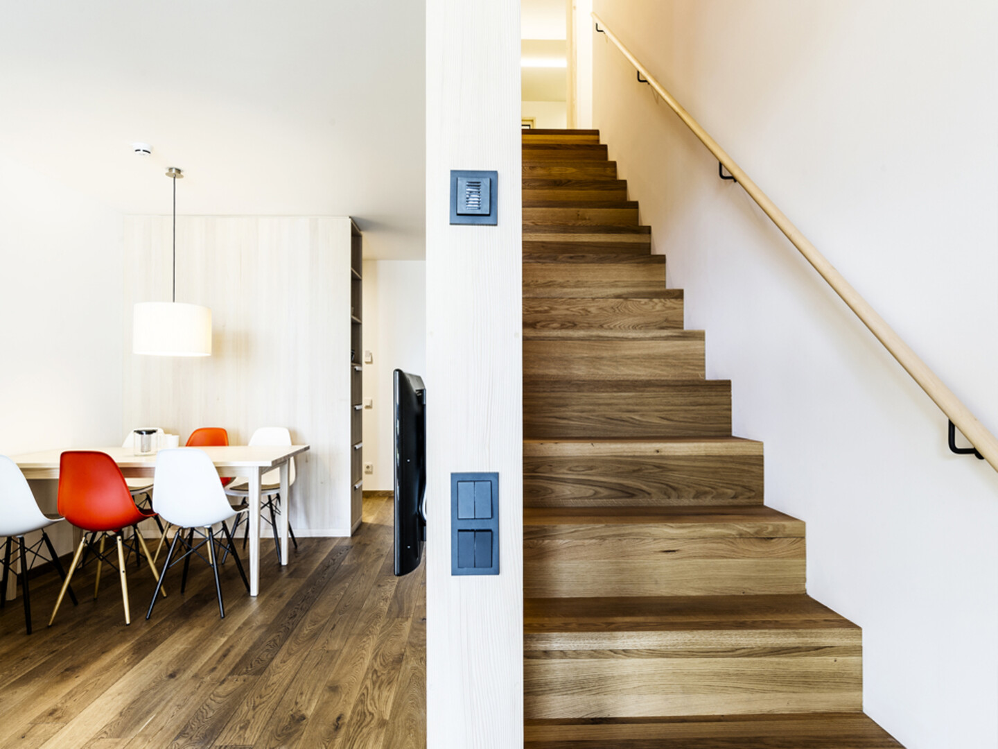 wo aus man zu den edel ausgestatteten Wohnungen gelangt. Diese verfügen über Echtholz-