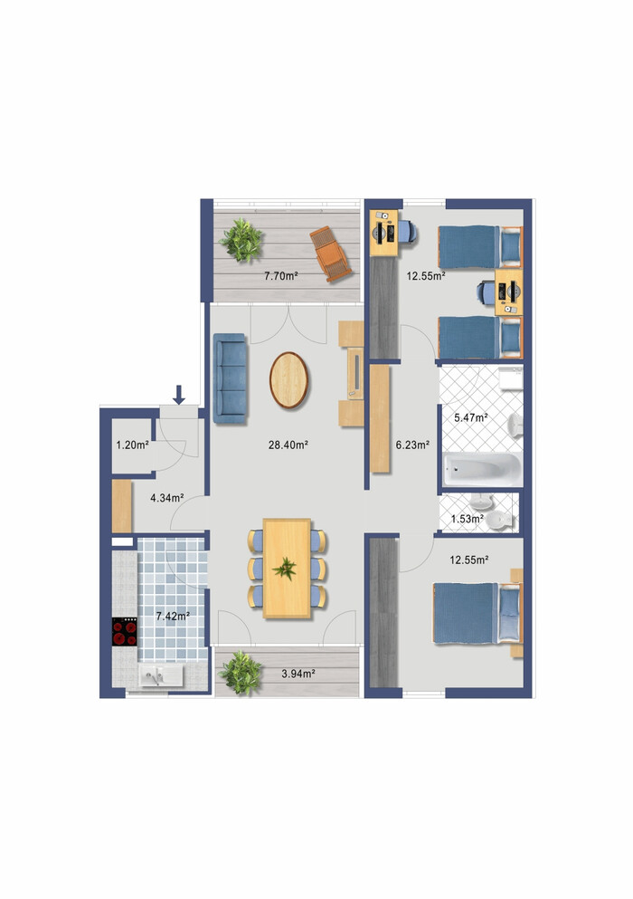Zur Raumaufteilung der ca.80 m² Wohnfläche: Es empfängt Sie einen Eingangsbereich mit Abstellraum und Garderobe. Ein wirklich großer lichtdurchfluteter Wohnraum mit Zugang zu zwei Balkonen, eine separate Küche, ein separates WC, ein Badezimmer mit Waschmaschinenanschluss sowie zwei Schlafzimmer.