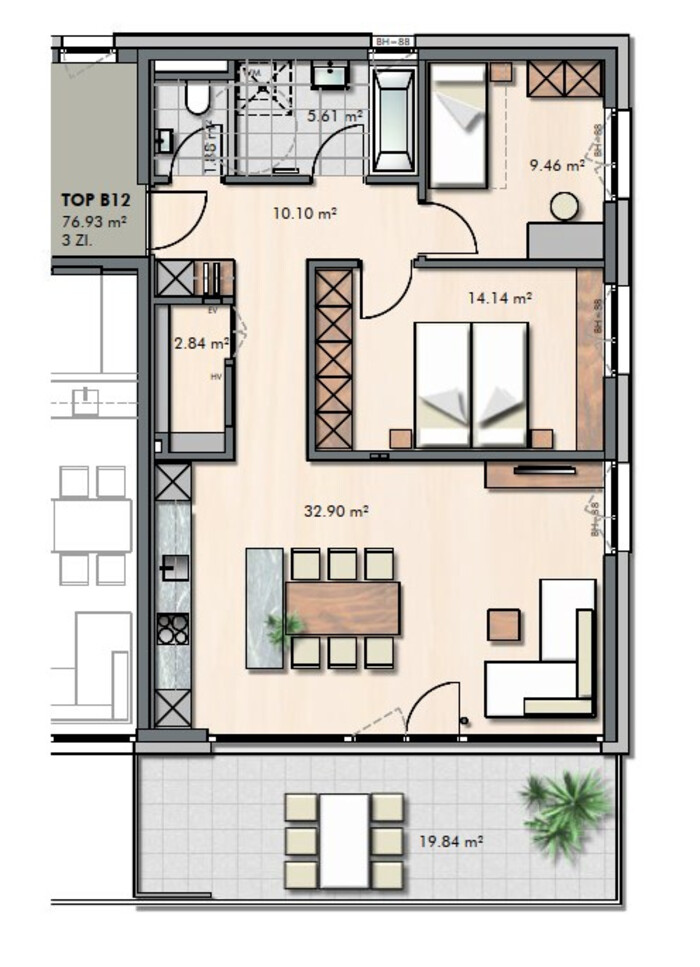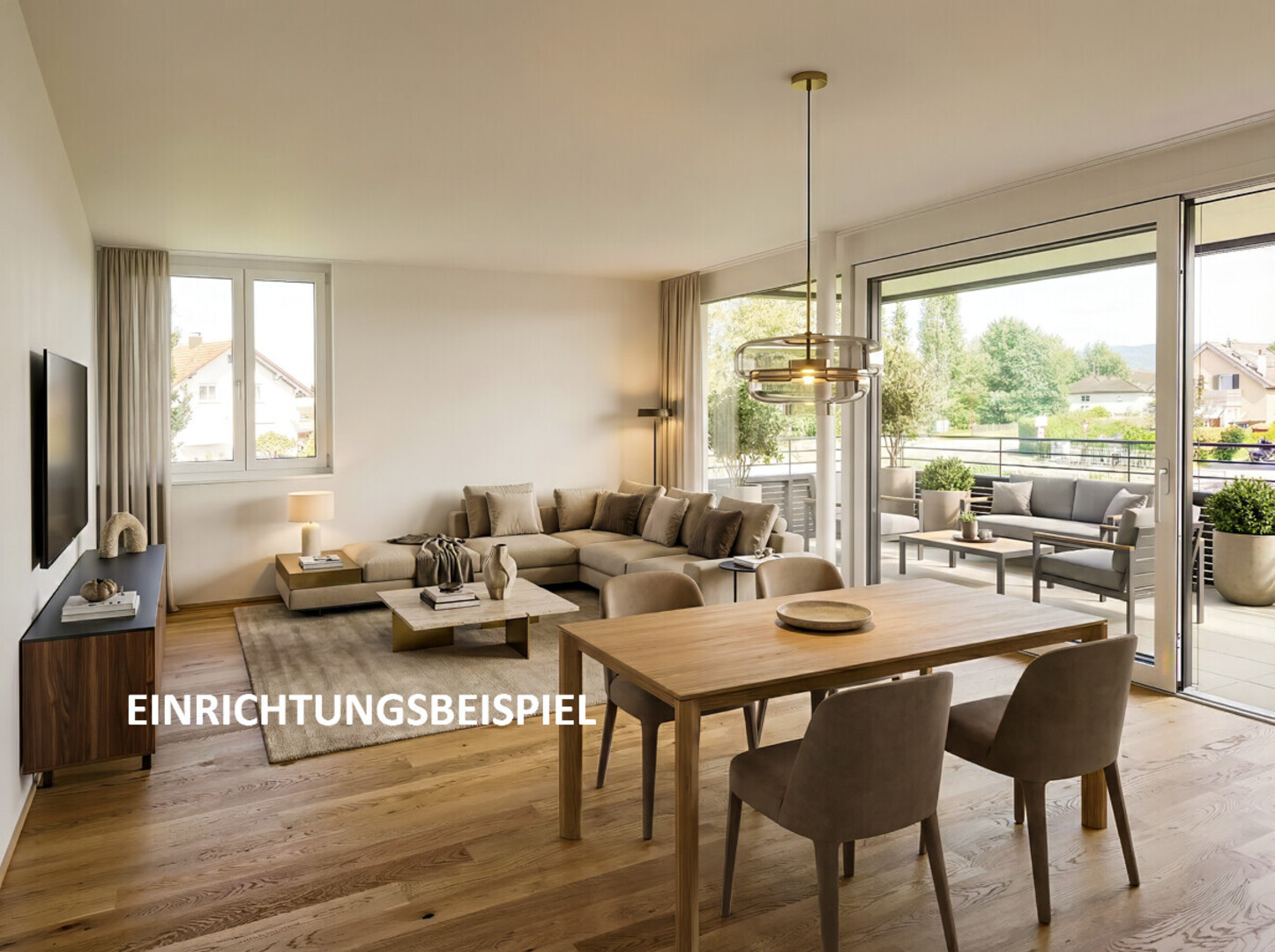 Diese rund 76 m² große 3-Zimmerwohnung im 1. Obergeschoss besticht durch clevere Raumaufteilung und ein angenehmes Wohngefühl. Der offene Wohn-, Ess- und Kochbereich ist hell und großzügig gestaltet und öffnet sich direkt zur etwa 19 m² großen Süd-Ost-Terrasse – perfekt, um sonnige Tage draußen zu genießen. Große Panoramafenster sorgen für viel Tageslicht und schaffen eine einladende Atmosphäre. Die moderne 3-fach-Verglasung hält Lärm und Kälte zuverlässig fern. Das Tageslichtbad mit Badewanne, Fenster und praktischem Waschmaschinenanschluss sowie das separate WC bieten zusätzlichen Komfort. Ein Abstellraum in der Wohnung sorgt für genügend Stauraum. Abgerundet wird das Angebot durch einen Tiefgaragenstellplatz und ein eigenes Kellerabteil – praktisch und bequem.