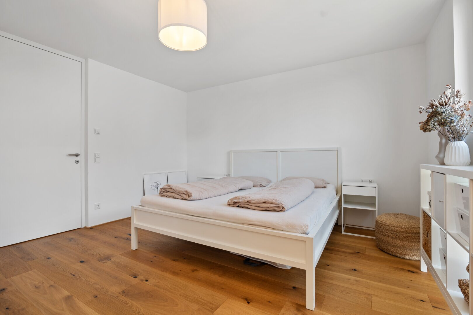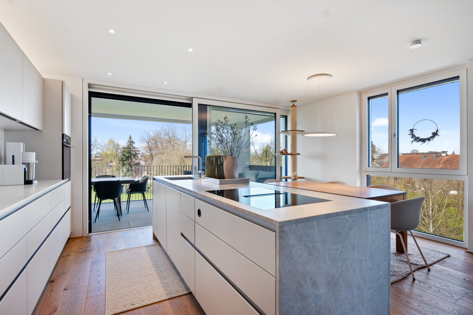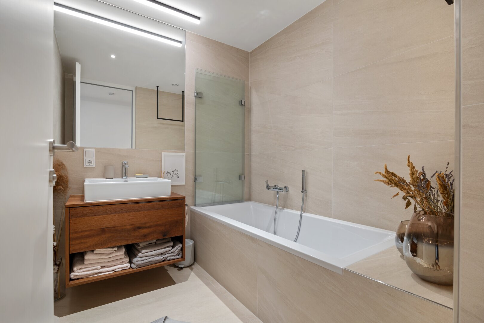 Innen bietet die Wohnung eine voll ausgestattete Einbauküche, in der Sie Ihre kulinarischen Fähigkeiten entfalten können. Die modernen Badezimmer sind jeweils mit einer Badewanne bzw. einer Dusche ausgestattet. Zudem gibt es ein Gäste-WC.