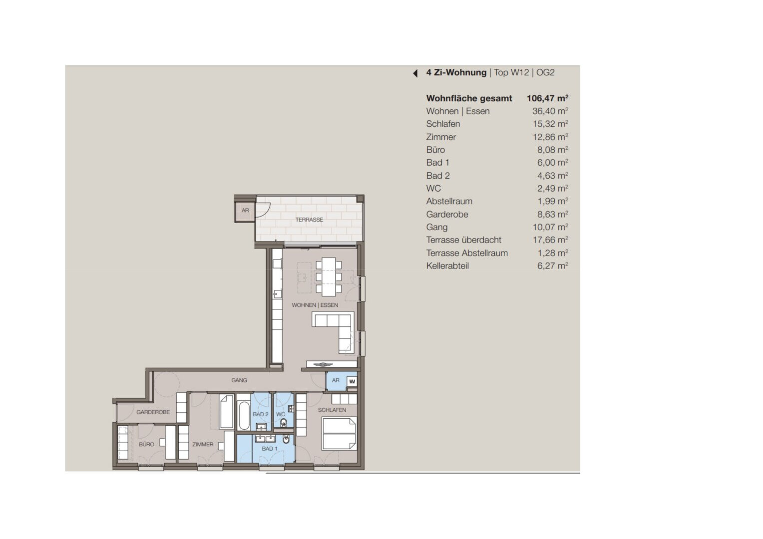 Die Wohnung verfügt über eine Terrasse, wo Sie die warmen Sommertage genießen können. Zudem gibt es zwei Tiefgaragenplätze, die um zusätzlich € 40.000,00 erworben werden können.