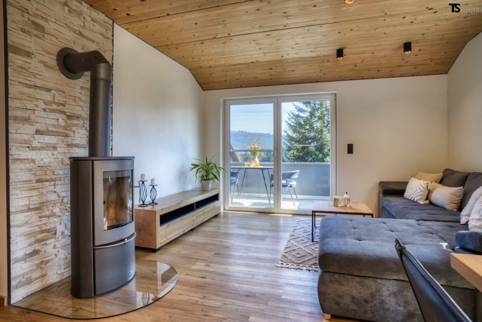 - Ein heller Wohnbereich mit Schwedenofen und direktem Zugang zum Balkon.