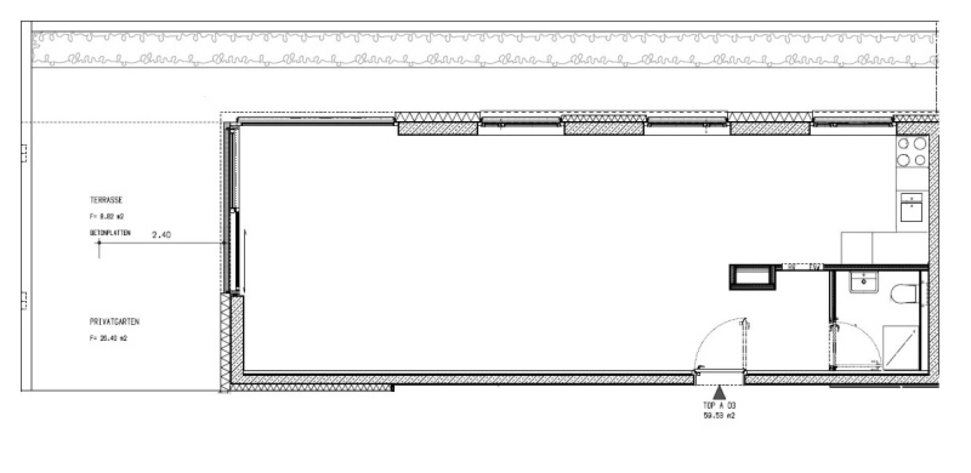 Wohnraum mit Küche, Bad/WC, Kellerabteil, sowie ein kleiner Gartenanteil mit Terrasse.