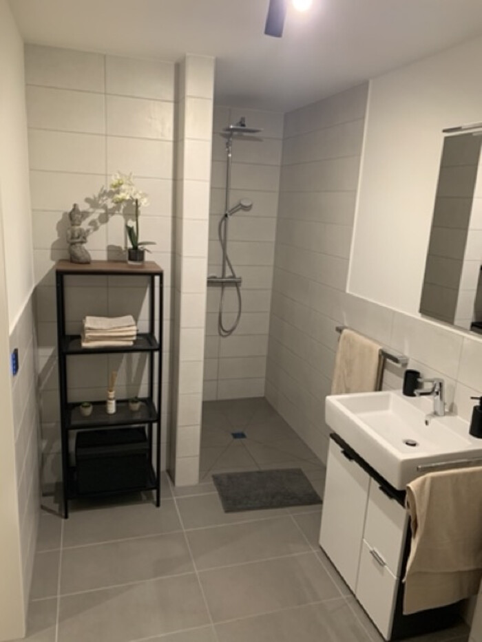 Der offene Wohn- und Essbereich mit Küche und Kochinsel bildet das Herzstück der Wohnung. Das moderne Badezimmer ist mit einer bodentiefen Dusche ausgestattet.