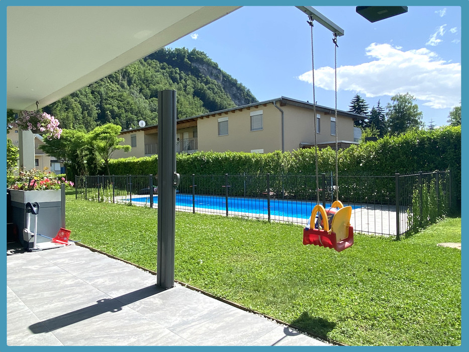 Die hochwertig ausgestattete Wohnung mit ca. 75,00 m² verfügt über ein helles und großes Wohn-und Esszimmer (ca. 39,00 m²) mit Zugang auf die ca. 30,00 m² große südlich ausgerichtete, überdachte Terrasse mit Zugang in den herrlich gestalteten Allgemeingarten mit Swimmingpool, eine moderne und maßgefertigte Tischlerküche, großes Elternschlafzimmer (ca. 13,50 m²) mit Zugang auf die Terrasse und den Garten, Kinderzimmer mit ca. 11,30 m², separates WC, hochwertiges Tageslichtbad mit großer begehbarer Dusche.