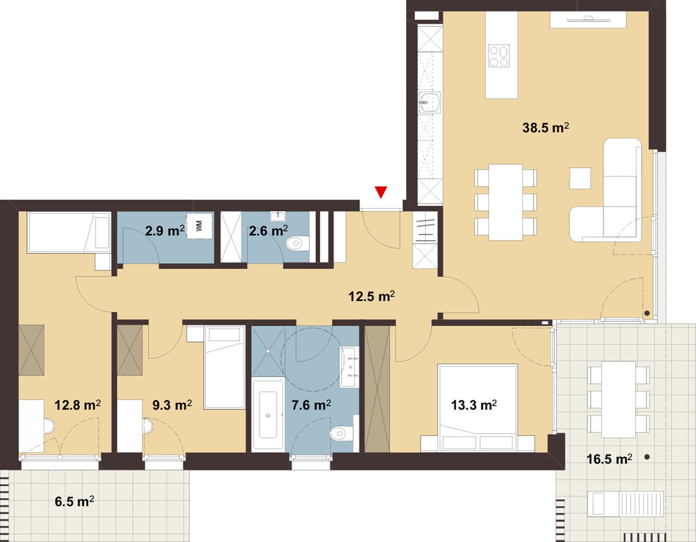 Hier wächst das Leben mit. Drei Zimmer bieten genug Raum für Familie, Gäste oder Hobbys. Der große Wohnbereich öffnet sich zur Terrasse, die nicht nur zum Essen im Freien einlädt, sondern auch an warmen Sommerabenden zum Lieblingsplatz wird.
