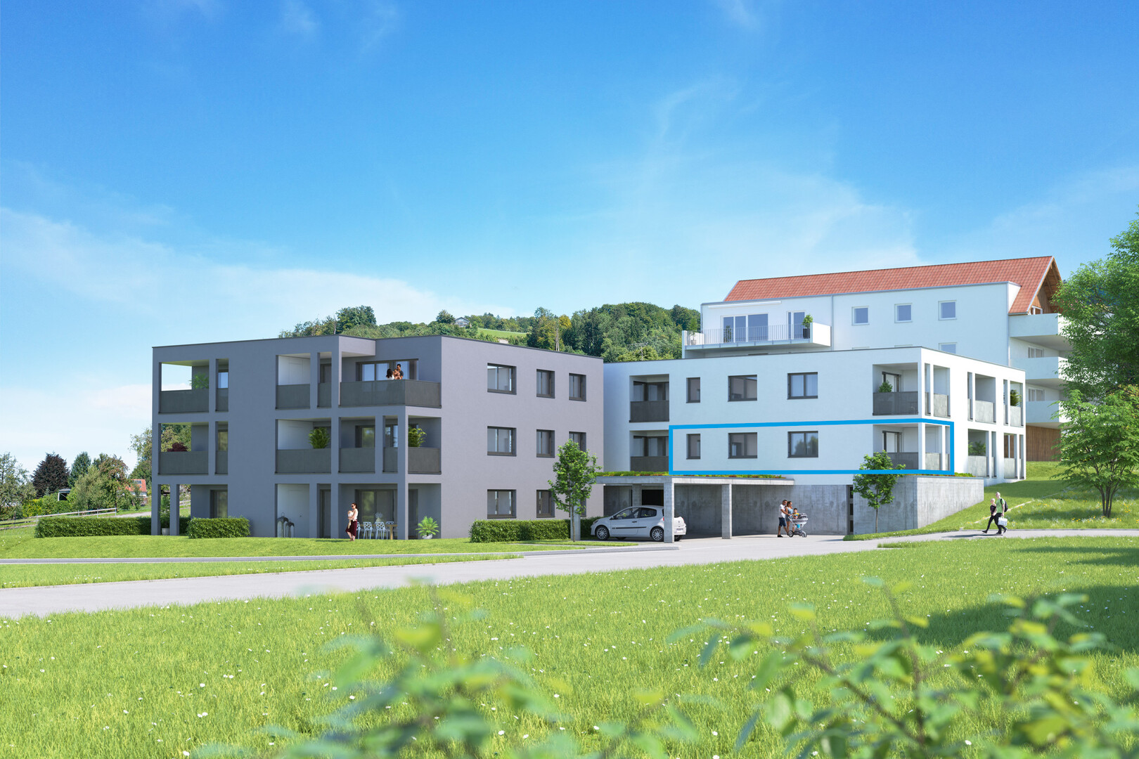 Der Hanglage optimal angepasst, fügen sich die beiden Gebäudekörper mit ihren insgesamt 18 Einheiten nahtlos ein. Hier können Interessierte zwischen 1-, 2-, 3- und 4-Zimmer-Wohnungen wählen.