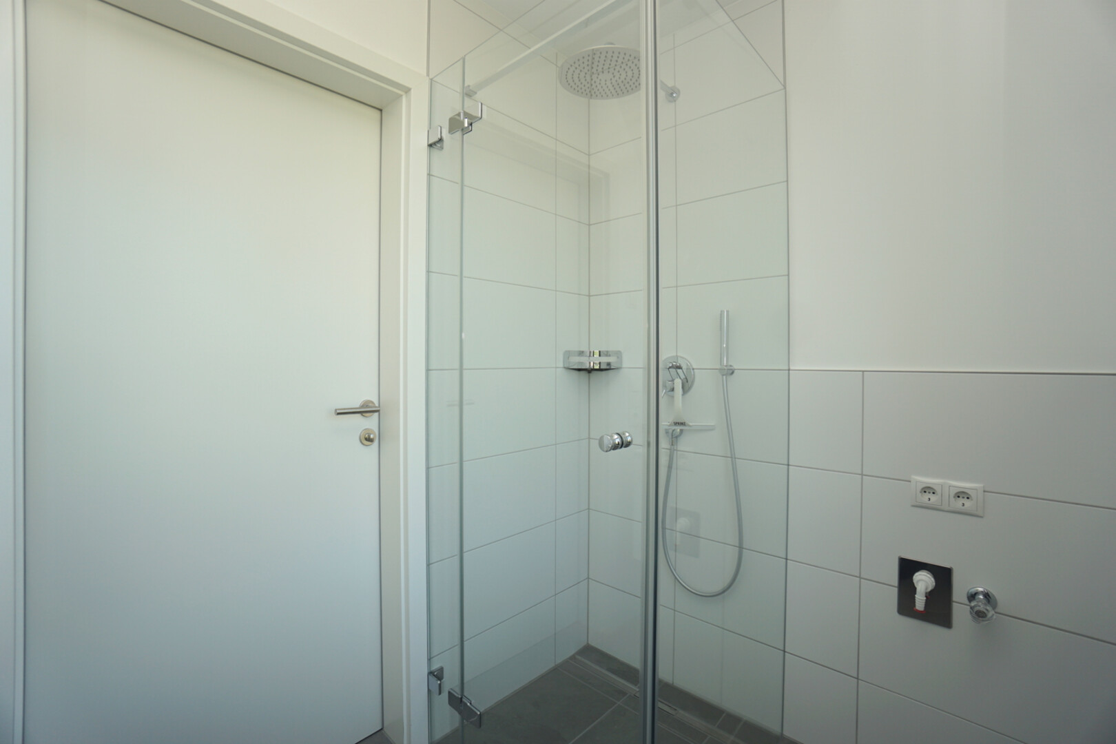 Das Badezimmer ist mit Fliesen versehen worden und verfügt über eine ebenerdige Dusche und ein WC. Ein modernes Waschbecken runden die Ausstattung im Badezimmer ab.