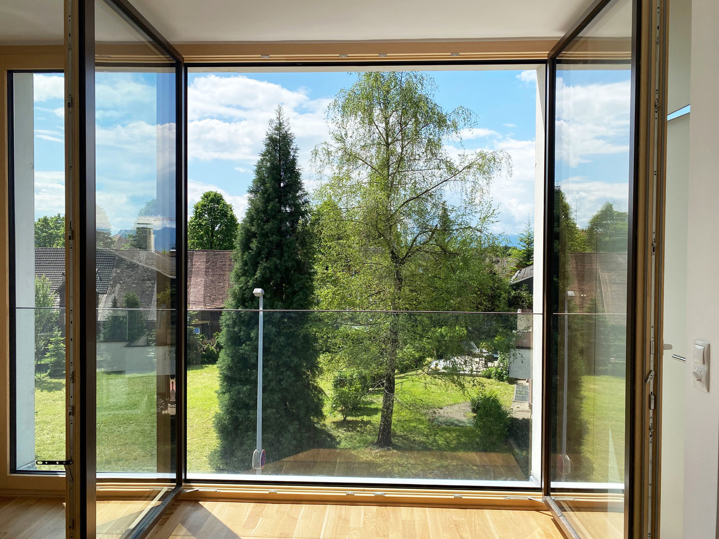 Für die Bewohner des Hauses steht eine großzügige Dachterrasse zur gemeinschaftlichen Nutzung bereit. Von dort aus können Sie den wunderbaren Ausblick auf die umliegenden Berge und die Stadt genießen.