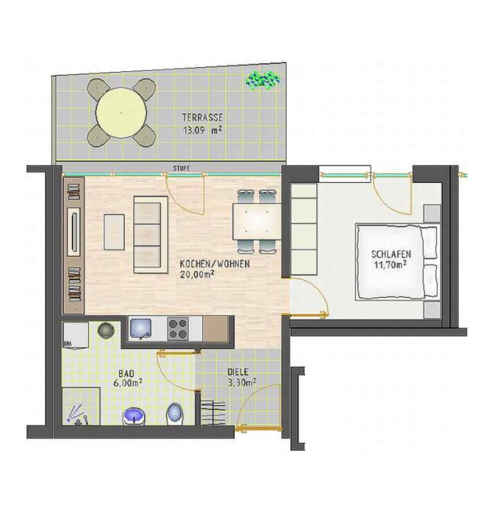 Im hellen Wohn-/Koch-/Essbereich wurde ein Stabparkettboden verlegt und eine Einbauküche in der Kochnische verbaut. Sie gelangen sowohl über den Wohnbereich als auch über das Schlafzimmer auf die ca. 13 m² große, nach Süden ausgerichtete, Terrasse.