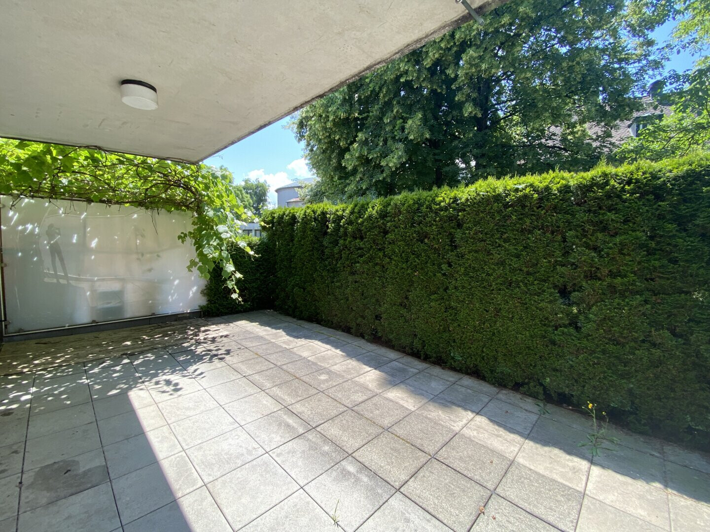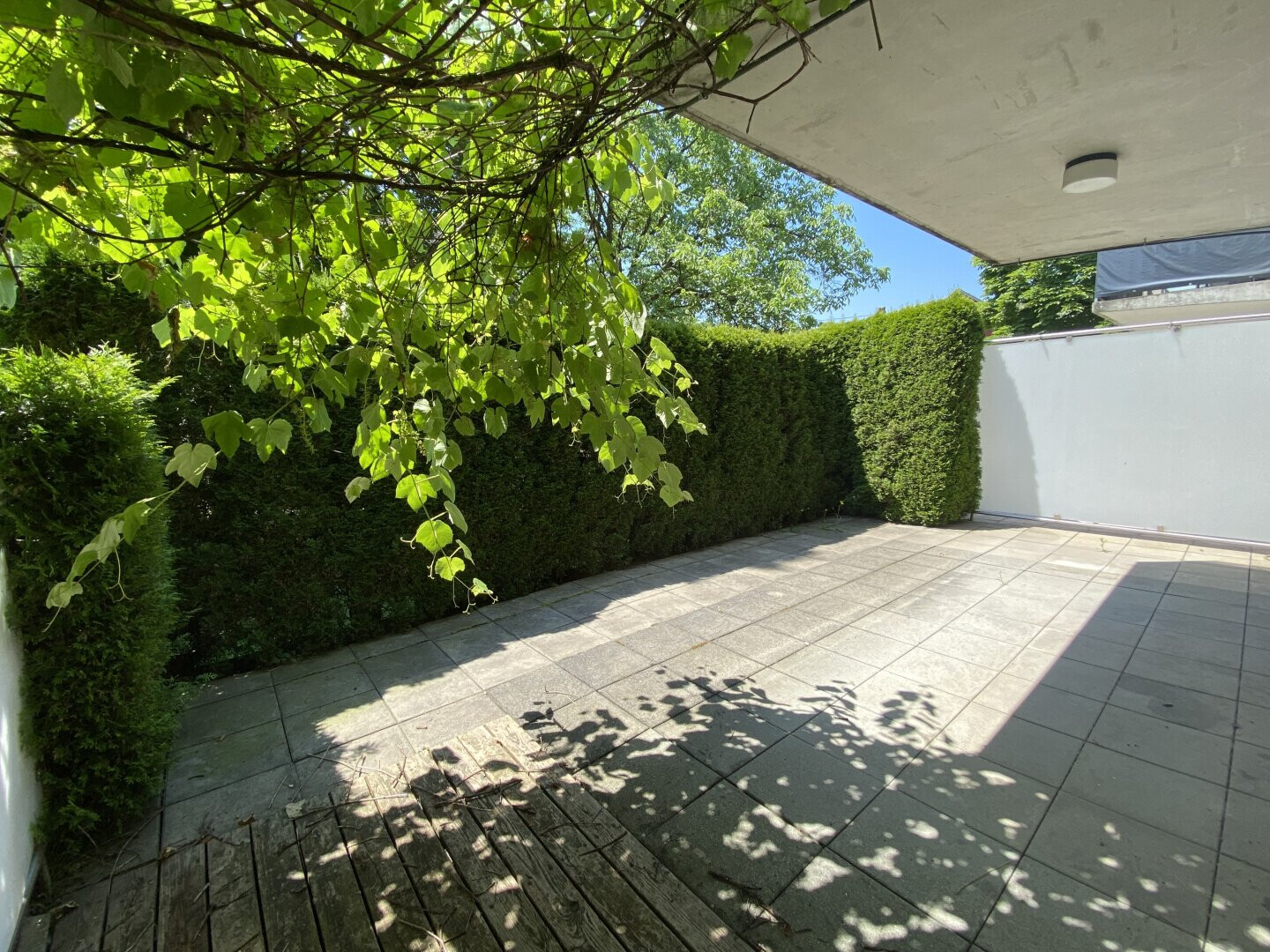 Ein absolutes Highlight ist die große, sichtgeschützte Terrasse. Dieses grüne Wohnzimmer erweitert den Wohnraum in den warmen Monaten ideal und bietet viel Platz zum Entspannen, Essen oder für Pflanzenliebhaber.