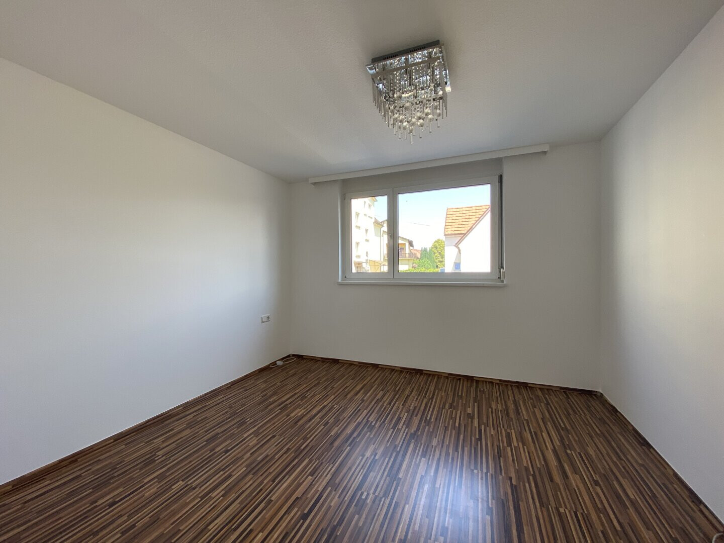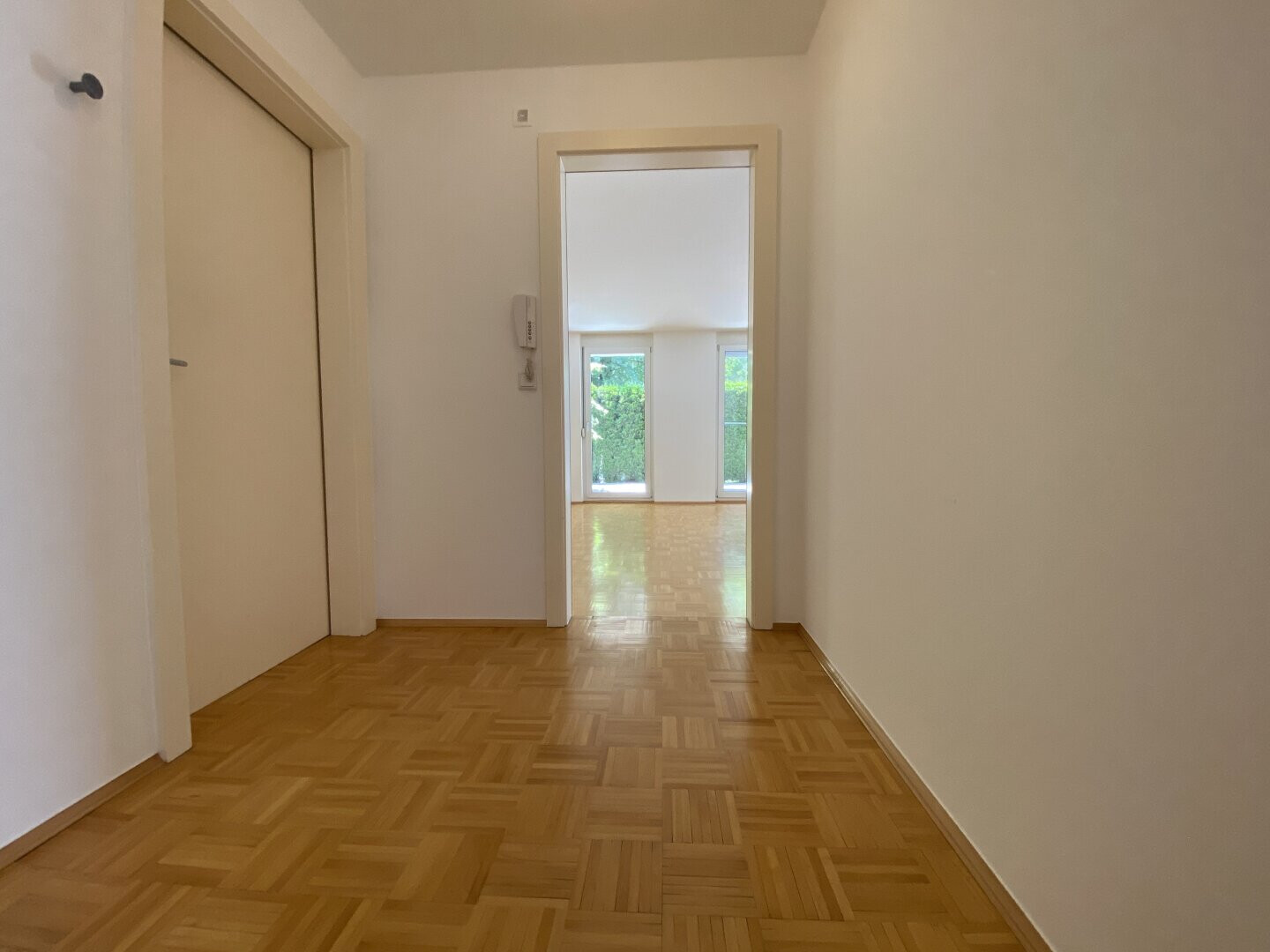 - Bodenbeläge: Wohnzimmer und Flur Parkett, Schlafzimmer Laminat, Abstellraum Linoleum, Badezimmer und WC Fliesen, Terrasse mit Steinfliesen