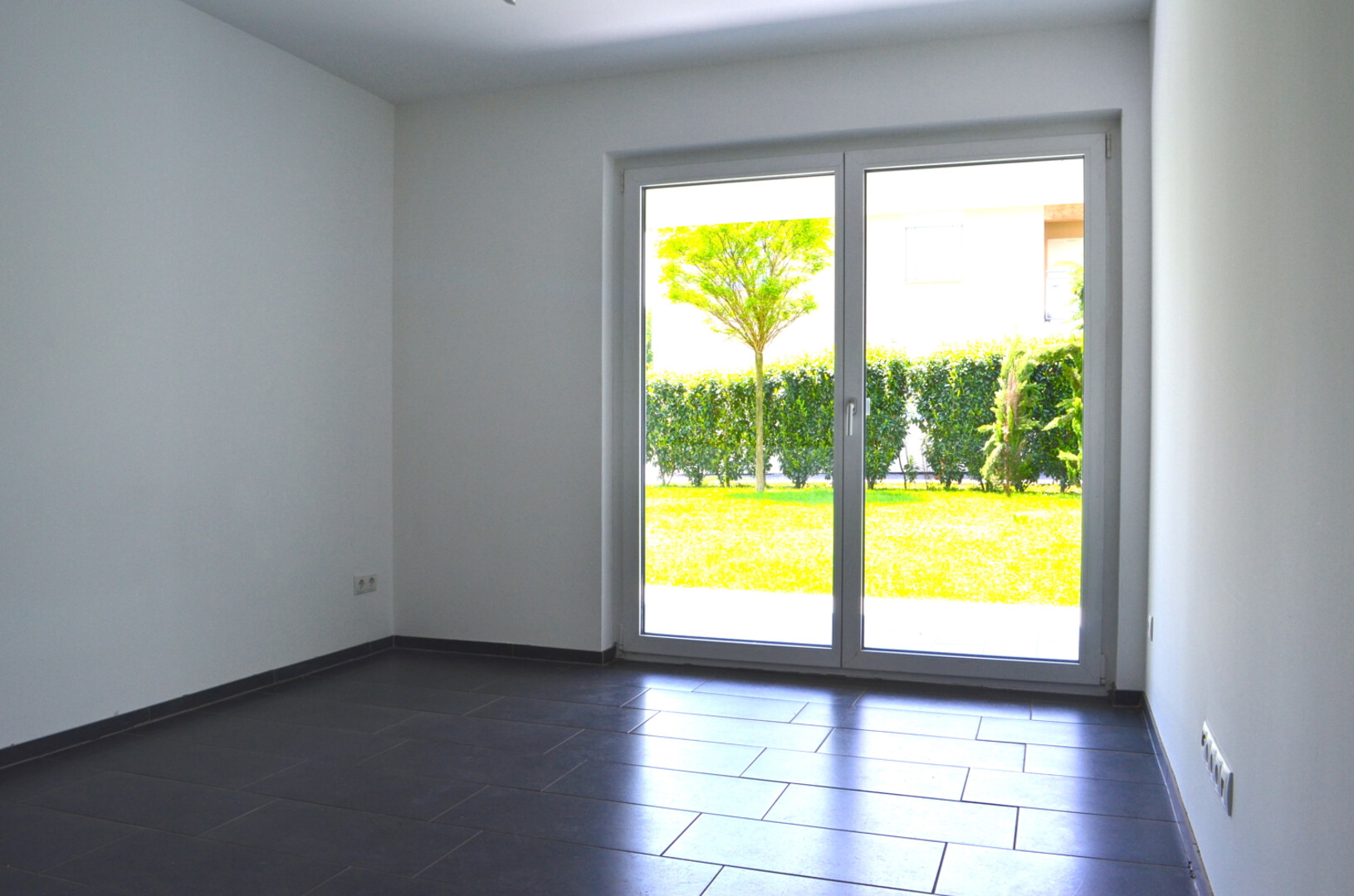 Durch die großen Glasfronten im Wohnbereich wird die Wohnung regelrecht mit Licht durchflutet. Im Badezimmer, im Eingangsbereich bis über den Wohn-/Kochbereich wurden pflegeleichte Fliesen verlegt. Im Schlafzimmer wurde ein Parkettboden verlegt.