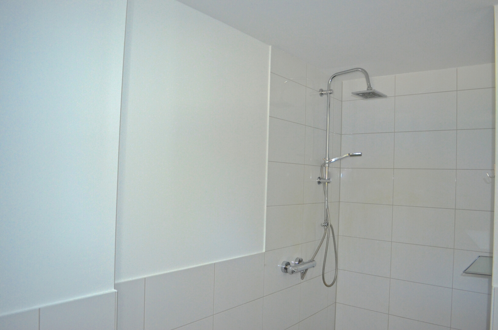 Das Badezimmer ist mit einer großen Dusche, Waschbecken und einem Waschmaschinenanschluss voll ausgestattet.