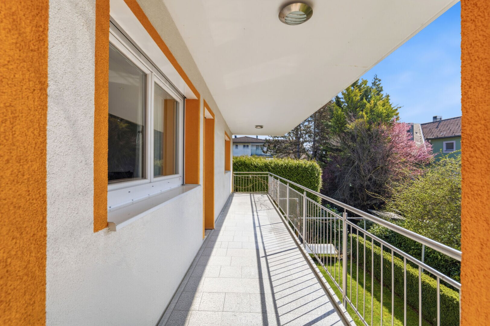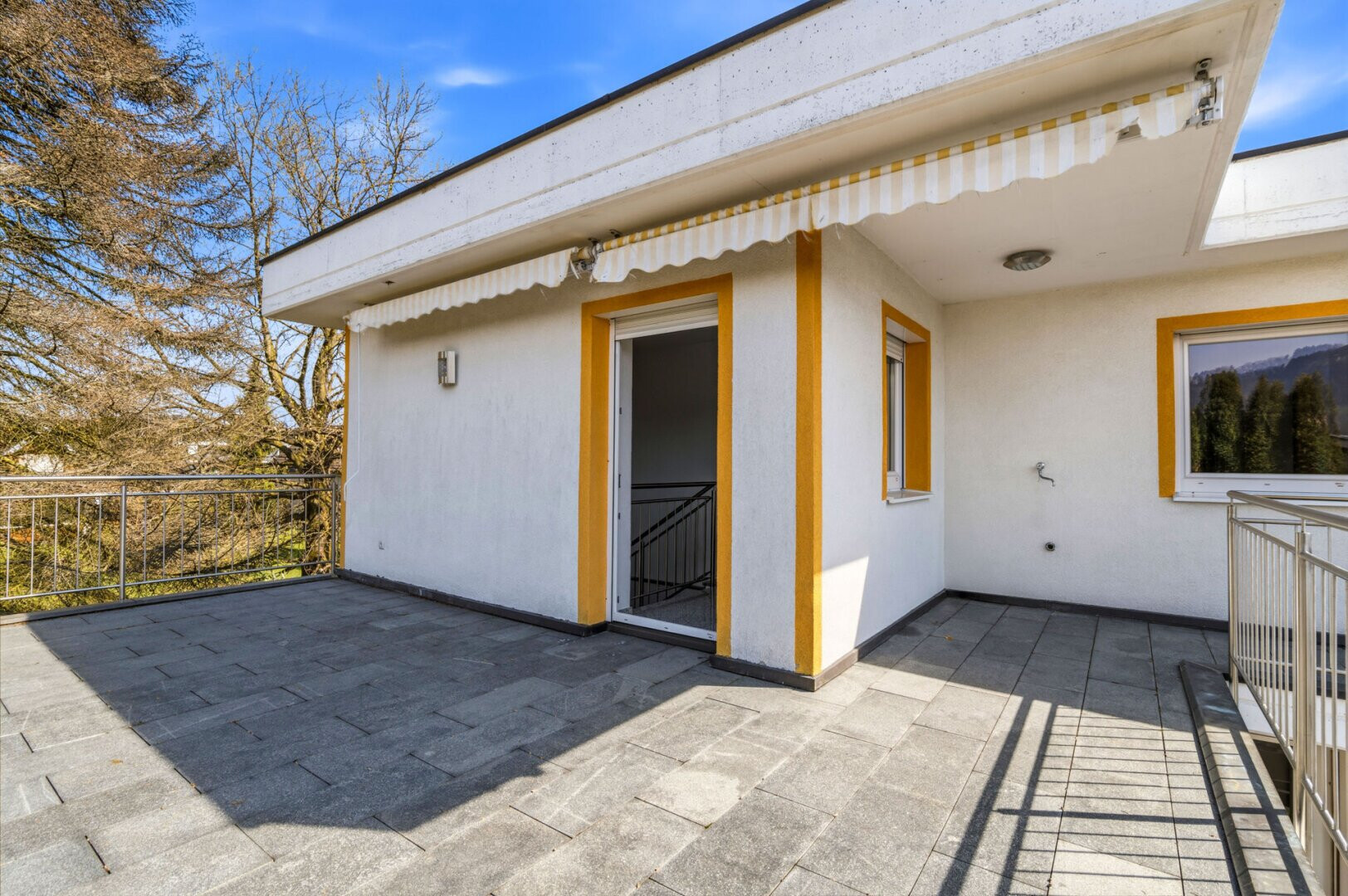 - Außenbereich: Terrasse mit robustem Steinzeugbelag