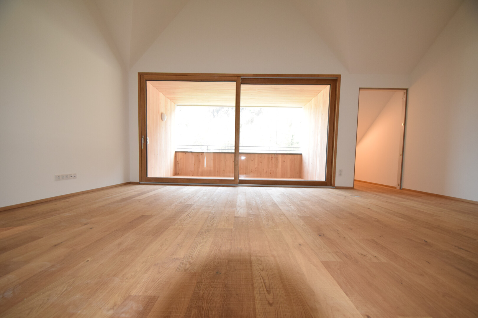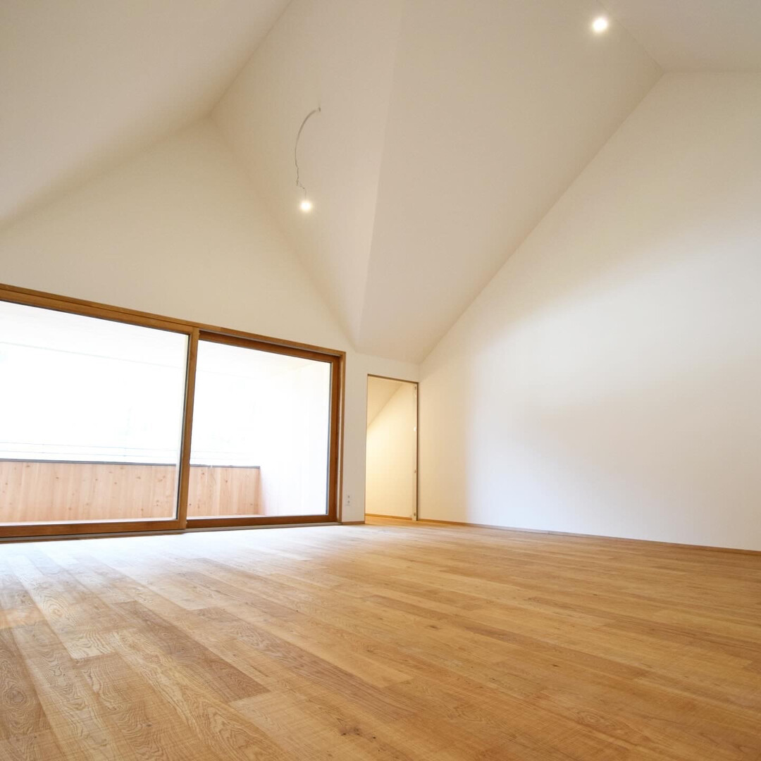 Die hochwertig ausgestattete 2-Zimmer-Wohnung im obersten Geschoss besticht durch die außerordentliche Raumhöhe mit Dachschrägen sowie einer Loggia mit Blick auf die Hohenemser Berglandschaft.
