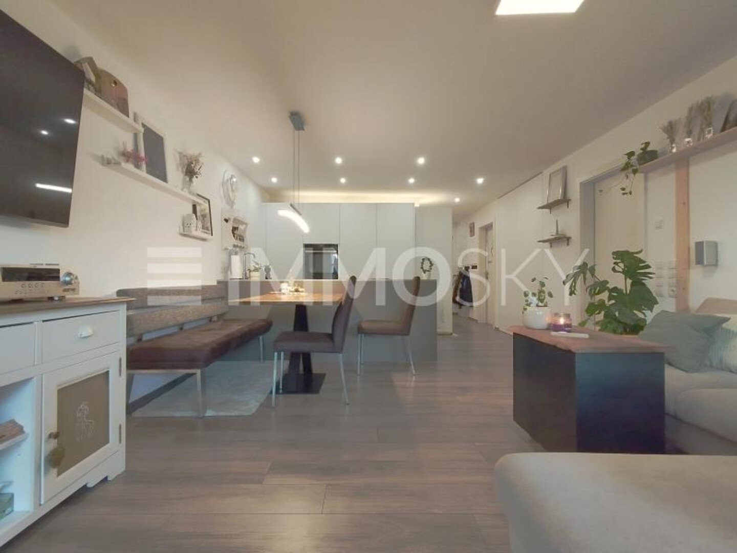 Diese hochwertig ausgestattete Wohnung bietet einen großzügigen Wohnbereich mit moderner Einbauküche und direktem Zugang zur sonnigen Terrasse sowie zum gepflegten Garten mit Whirlpool. Der Eingangsbereich verfügt über einen praktischen, in die Wand integrierten Abstellraum mit Waschmaschinenanschluss. Als Bodenbelag wurden hochwertige Natursteinzeug Fliesen in Holzoptik gewählt.