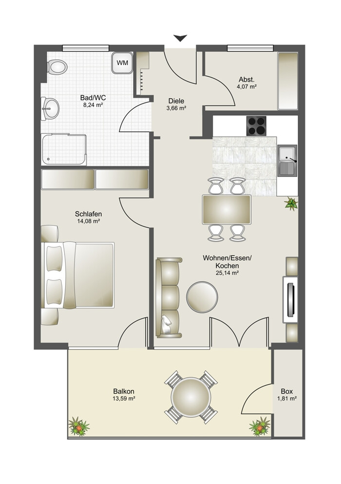 Diese gepflegte und lichtdurchflutete Wohnung im 1. Obergeschoss überzeugt mit einer durchdachten Raumaufteilung und einem modernen Wohnambiente. Das Herzstück bildet der offene Ess- und Wohnbereich mit stilvoll integrierter Küche. Sowohl vom Wohnbereich als auch vom Schlafzimmer gelangen Sie direkt auf die großzügige Terrasse, die zusätzlichen Wohnraum im Freien bietet. Hier lassen sich entspannte Abende, sonnige Stunden oder gemütliche Frühstücke genießen. Ein modernes Badezimmer mit Dusche, ein ruhiges Schlafzimmer sowie ein praktischer Abstellraum runden dieses attraktive Wohnangebot perfekt ab. Ein eigenes Kellerabteil sorgt für zusätzlichen Stauraum, und ein Tiefgaragenstellplatz bietet komfortables und sicheres Parken.