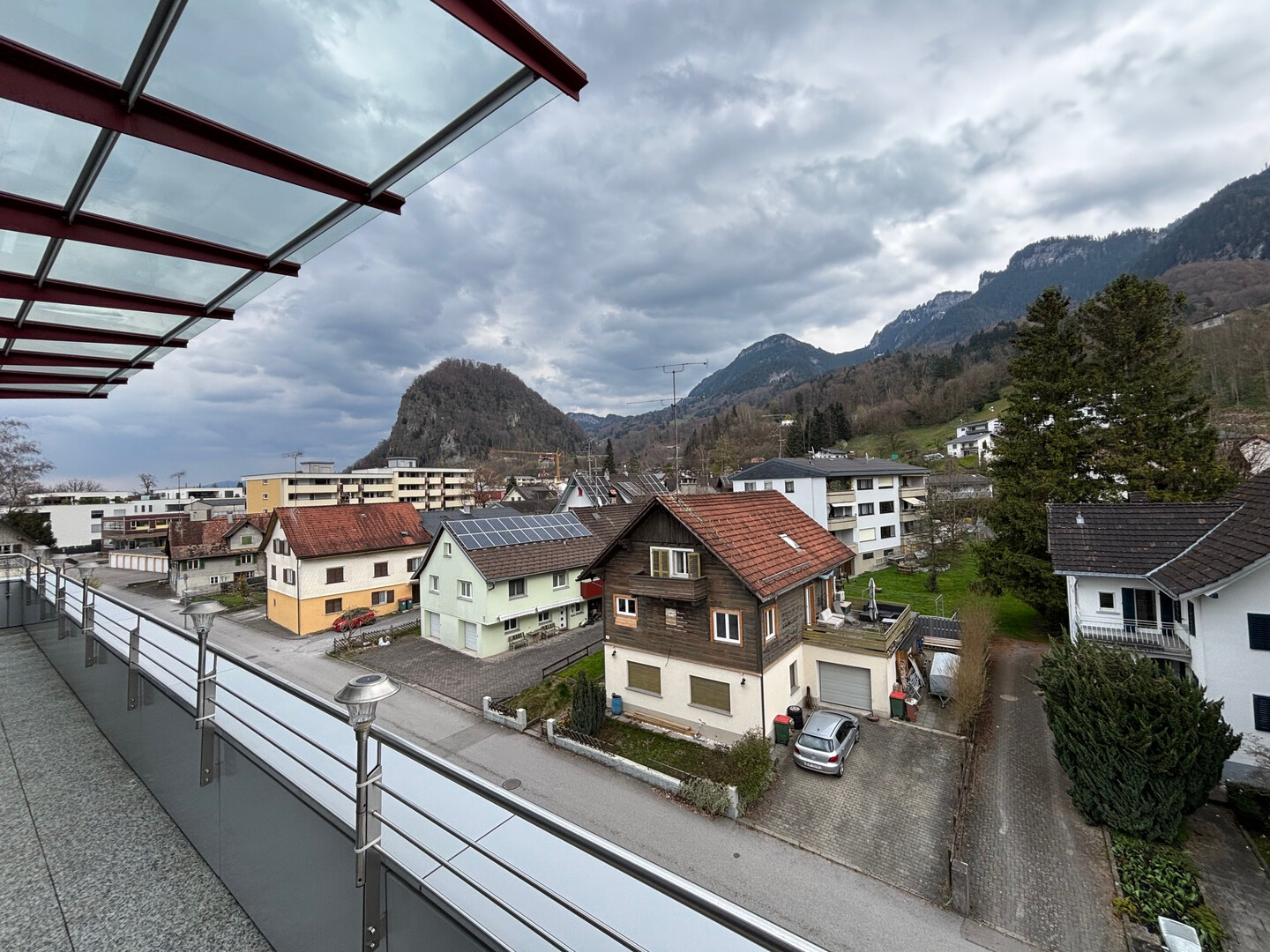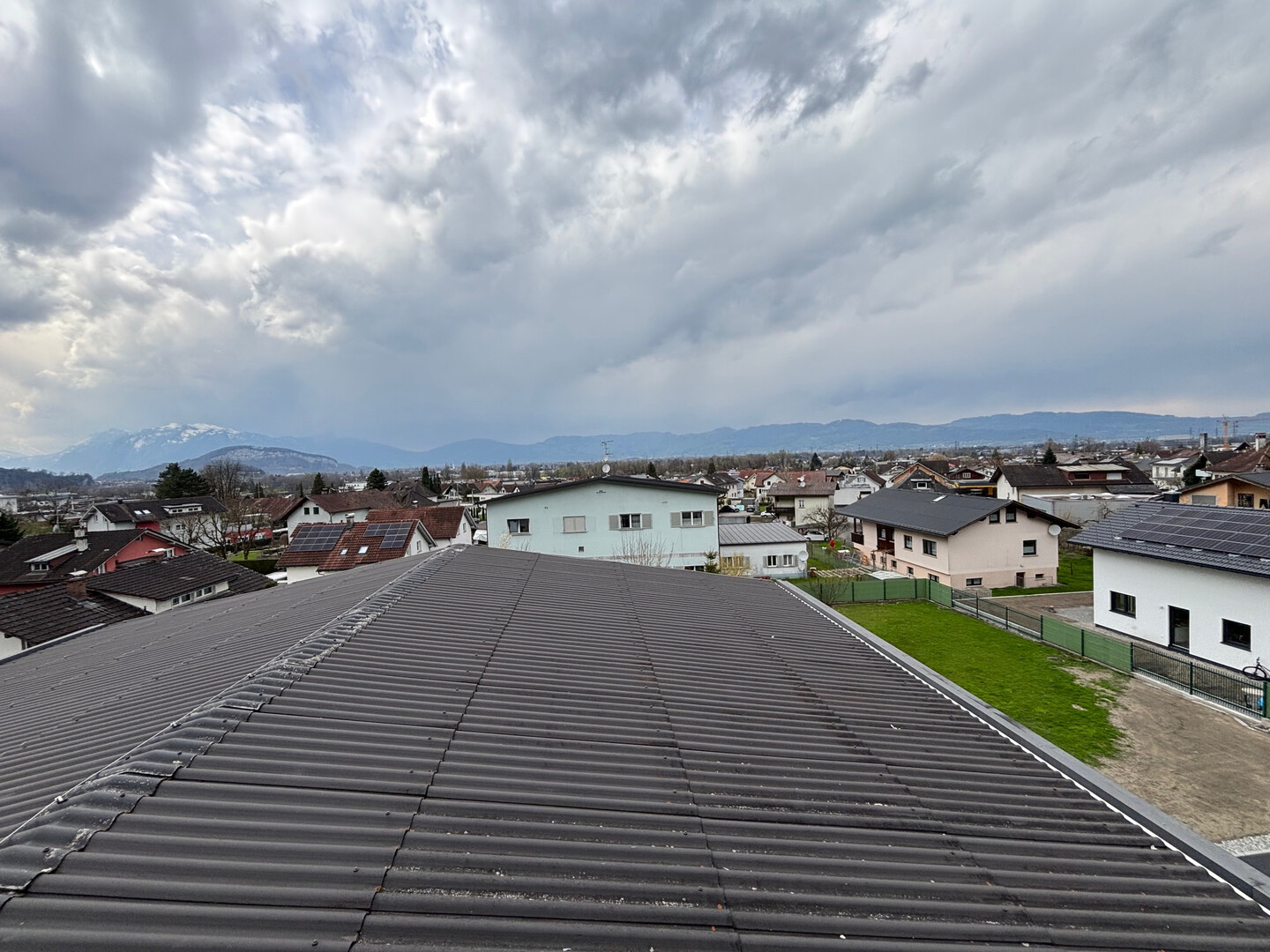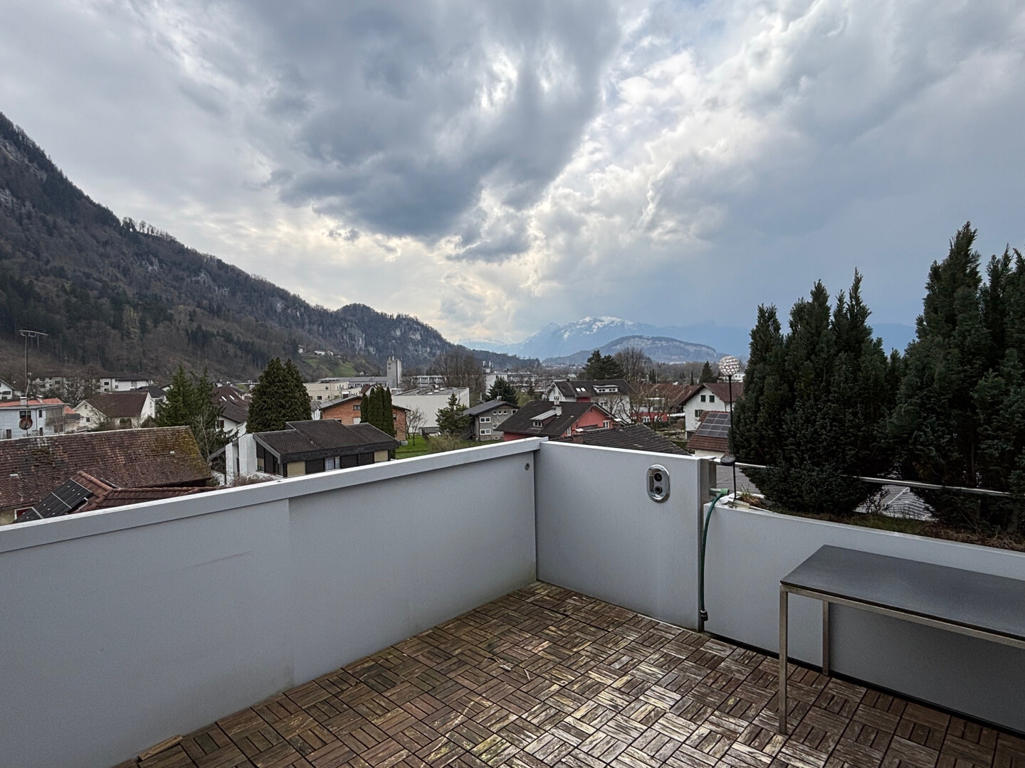 - Großzügiger Sitzplatz/Terrasse nach Westen mit freiem Blick in Richtung Schweizer Berge