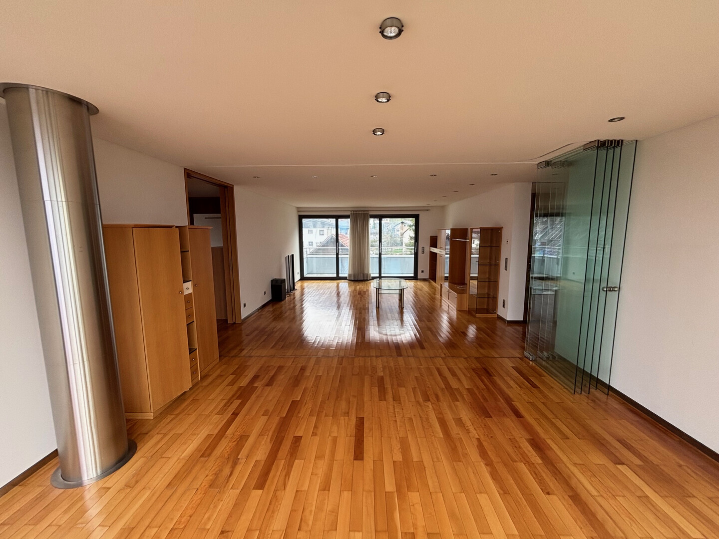 - Heller Wohnbereich mit großen Glas-Schiebeelementen, die den Raum flexibel in zwei Bereiche teilen