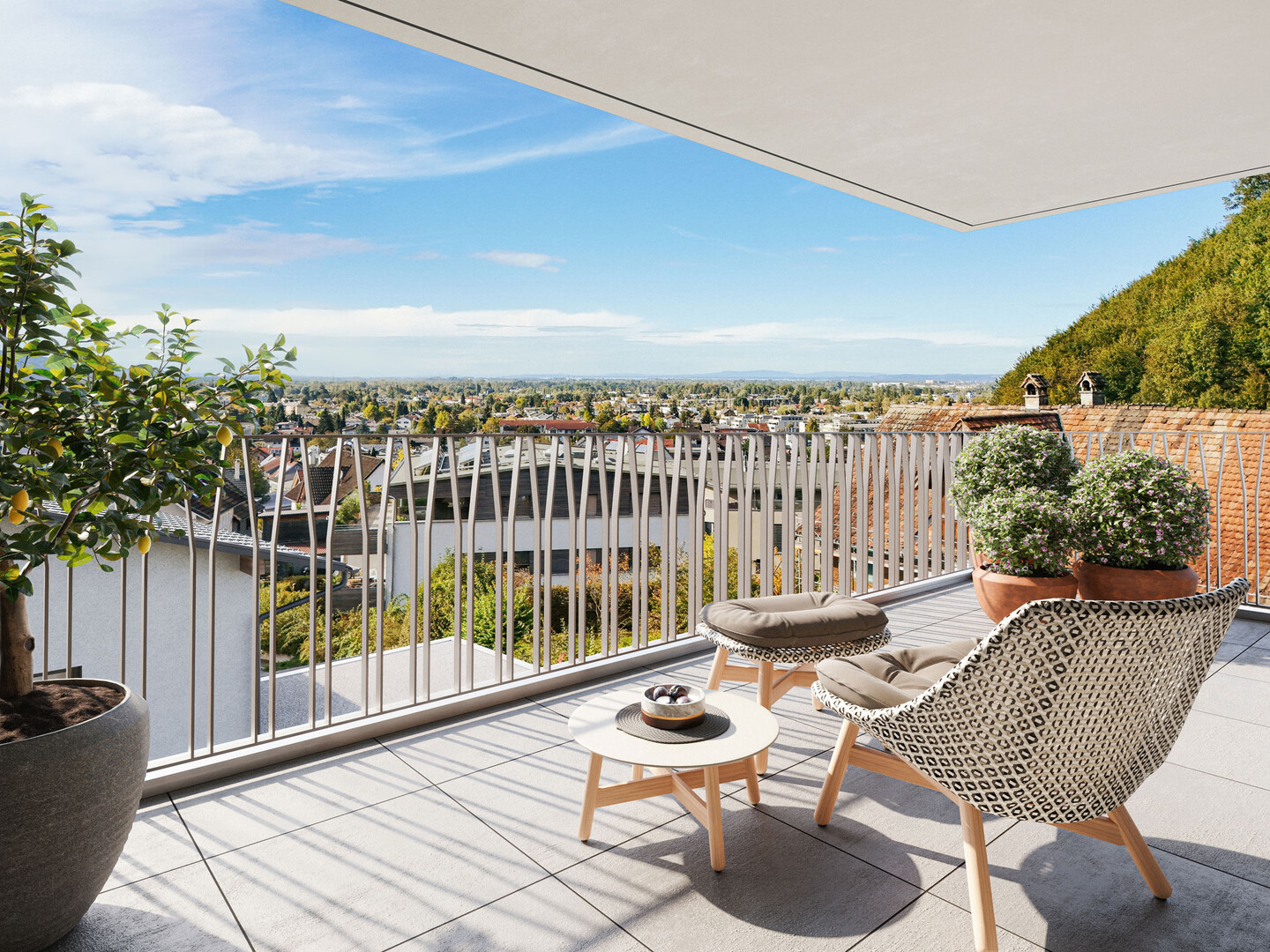 Sonnige Wohnqualität: Die überdachte Terrasse dieser Obergeschosswohnung schafft ein geschütztes Outdoor-Wohnzimmer, das zu jeder Jahreszeit genutzt werden kann. Genießen Sie die Aussicht und das helle, offene Wohnkonzept.