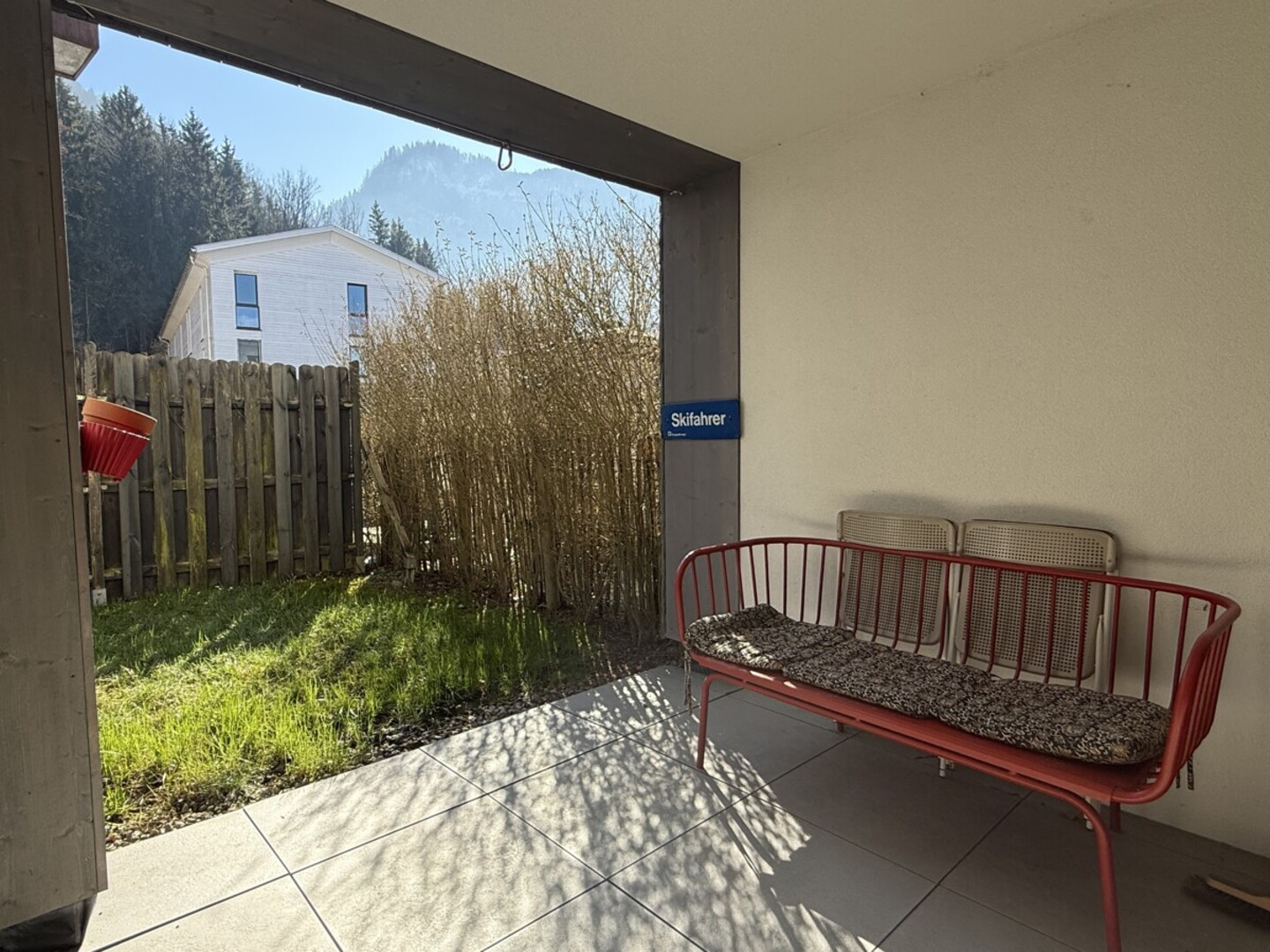 Ein besonderes Highlight ist der kleine Privatgarten, der direkt an den Wohnbereich anschließt und zusätzlichen Freiraum im Grünen bietet. Die überdachte Terrasse erweitert den Wohnraum nach außen und lädt bei nahezu jeder Witterung zum Verweilen ein.