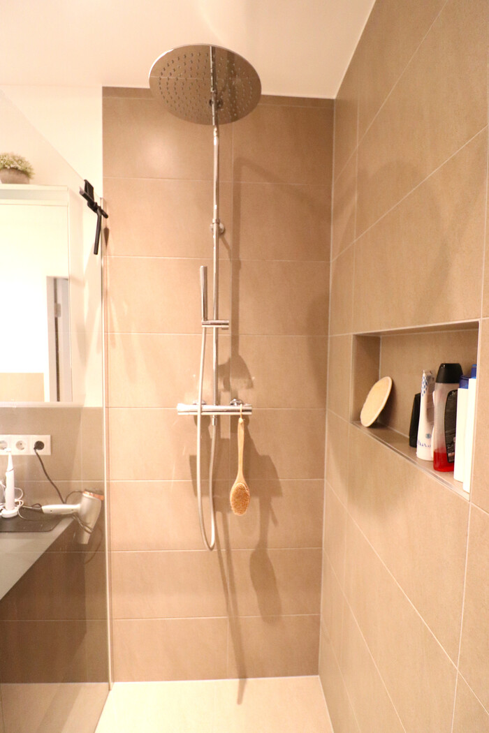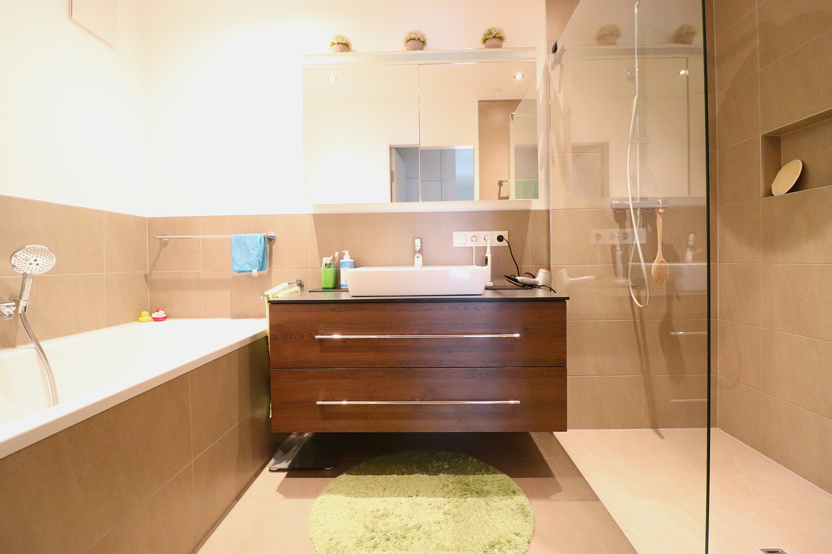 - Geschmackvoll verfliestes Badezimmer mit Wanne, begehbarer Dusche und integriertem Radio