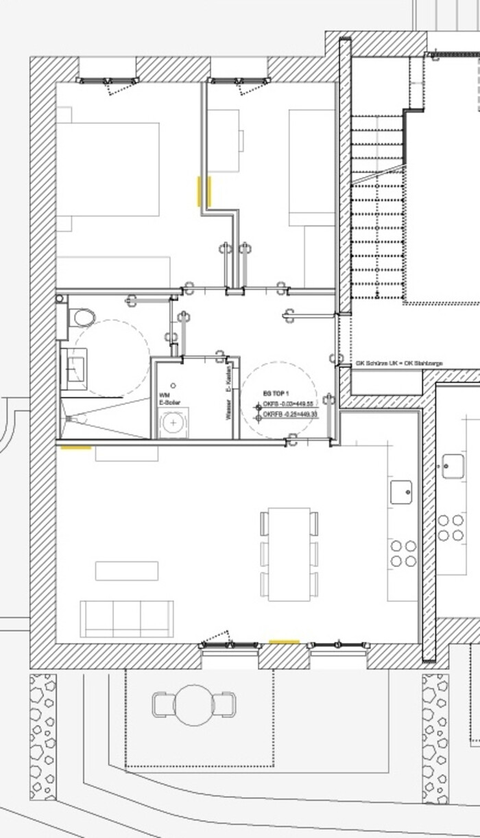 Genießen Sie entspannte Stunden auf der Terrasse, die zusätzlichen Wohnraum im Freien bietet. Der Zugang zum Keller gewährleistet zusätzlichen Stauraum und Komfort.