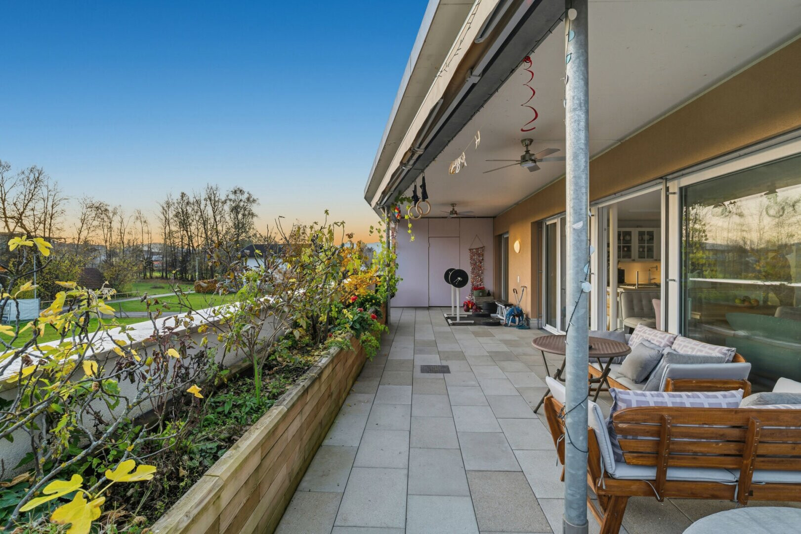 Für heiße Sommerabende verfügt die Terrasse auch über eine hochwertige Terrassenbeschattung sowie Ventilatoren.
