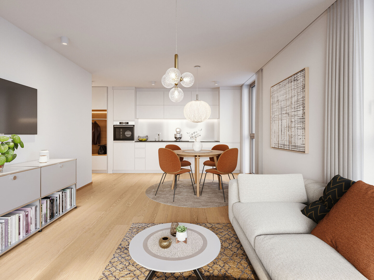 Ein durchgängig offener Wohnbereich und ein separates Schlafzimmer bieten eine ideale Raumaufteilung für eine oder zwei Personen. Die Terrasse ist direkt vom Wohnbereich aus zugänglich und erweitert den Wohnraum ins Freie.