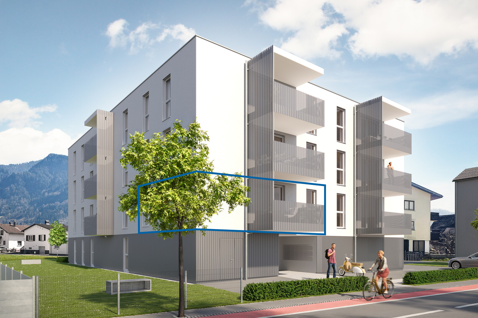 Die Wohnanlage St.-Gebhard-Straße wurde mit 20 Wohneinheiten so geplant, dass mit Hilfe durchdachter Grundrissplanung in Kombination mit der hoch attraktiven Wohnbauförderung und einem Sonderfinanzierungsmodell Volleigentum wieder finanzierbar wird.