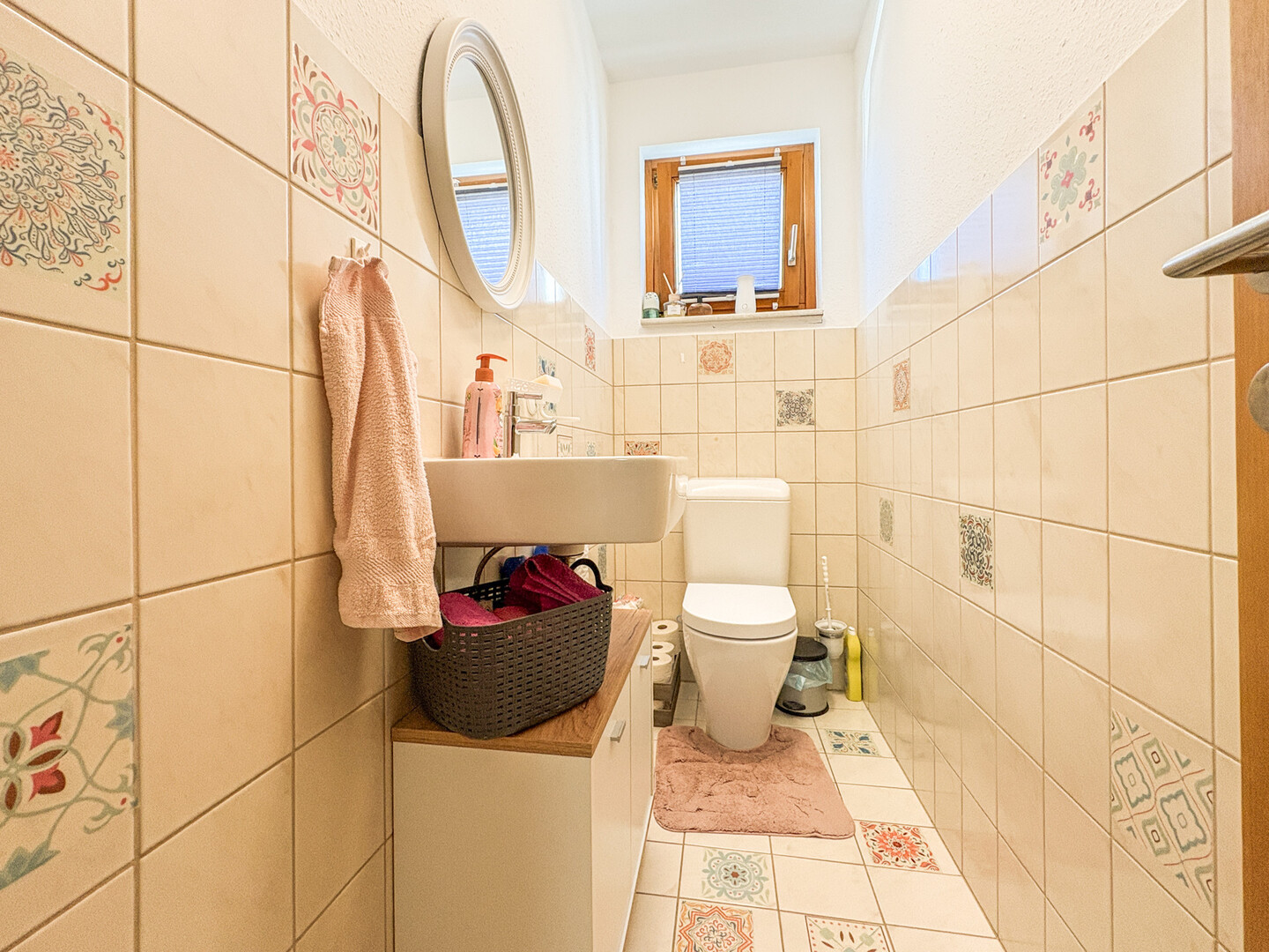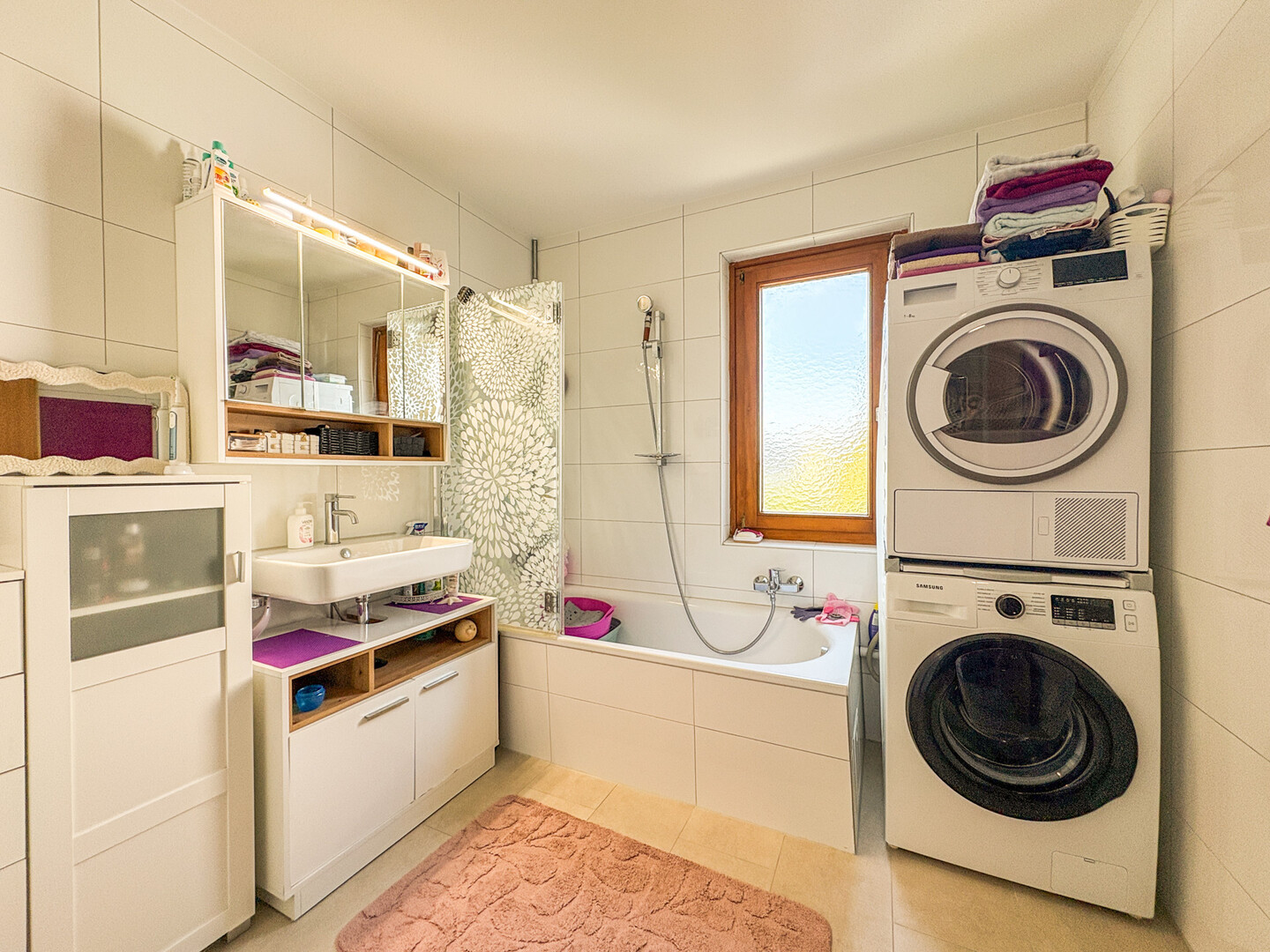 Komfort bieten ein stilvolles Bad mit Wanne und Fenster, ein separates WC sowie ein praktischer Abstellraum.