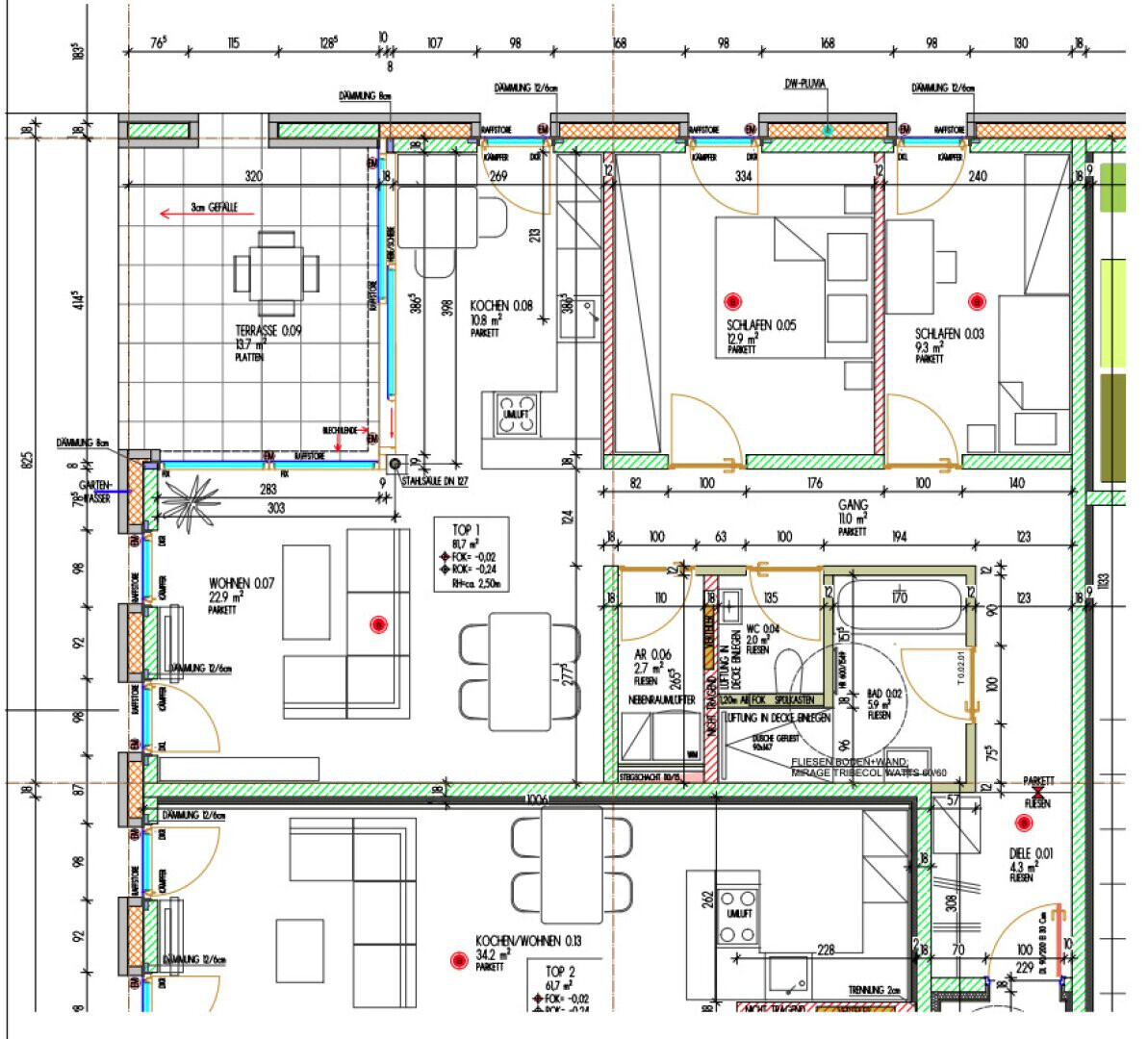 Im Innenbereich sorgen edle Echtholzböden in Wohn- und Schlafräumen sowie hochwertige Natursteinfliesen in Bad und separatem Gäste-WC für stilvolle Eleganz. Die Architektur stammt vom renommierten Büro Baumschlager Hutter Partners, das für klare Linien, moderne Ästhetik und außergewöhnliche Wohnqualität bekannt ist.
