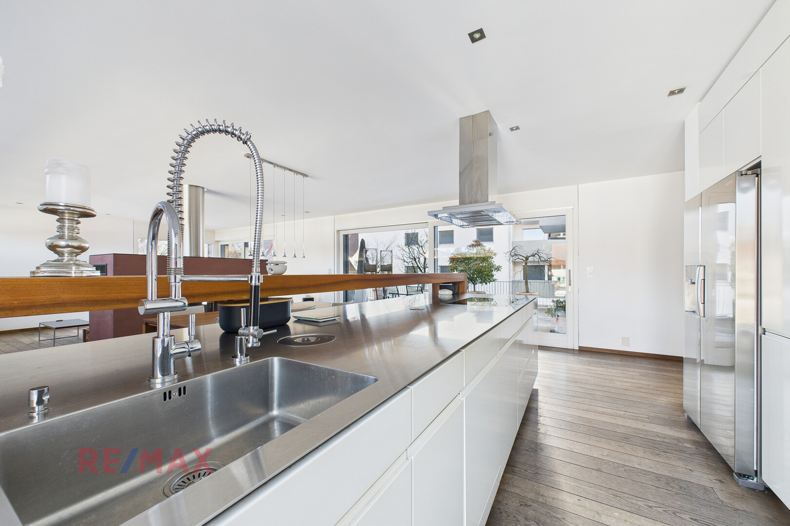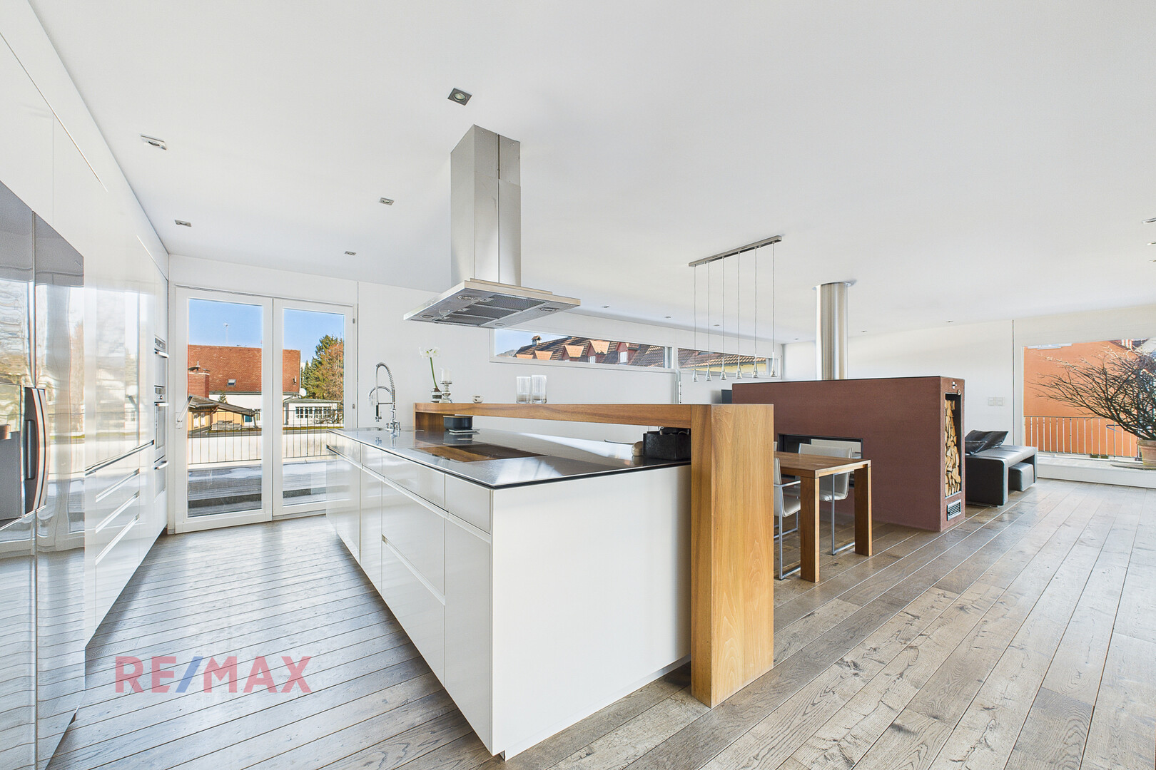 Ein Highlight ist der elegante Ofen, der für Wärme und eine angenehme Raumaufteilung sorgt, sowie die hochwertige Küche mit großzügiger Insel und integriertem Barbereich.