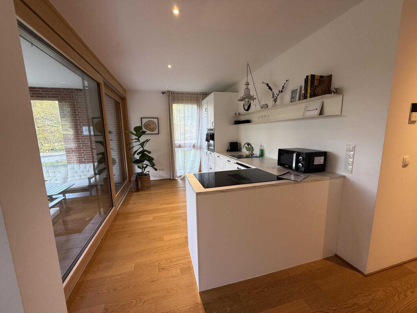 Im Innenbereich sorgen edle Echtholzböden in Wohn- und Schlafräumen sowie hochwertige Natursteinfliesen in Bad und separatem Gäste-WC für stilvolle Eleganz. Die Architektur stammt vom renommierten Büro Baumschlager Hutter Partners, das für klare Linien, moderne Ästhetik und außergewöhnliche Wohnqualität bekannt ist.