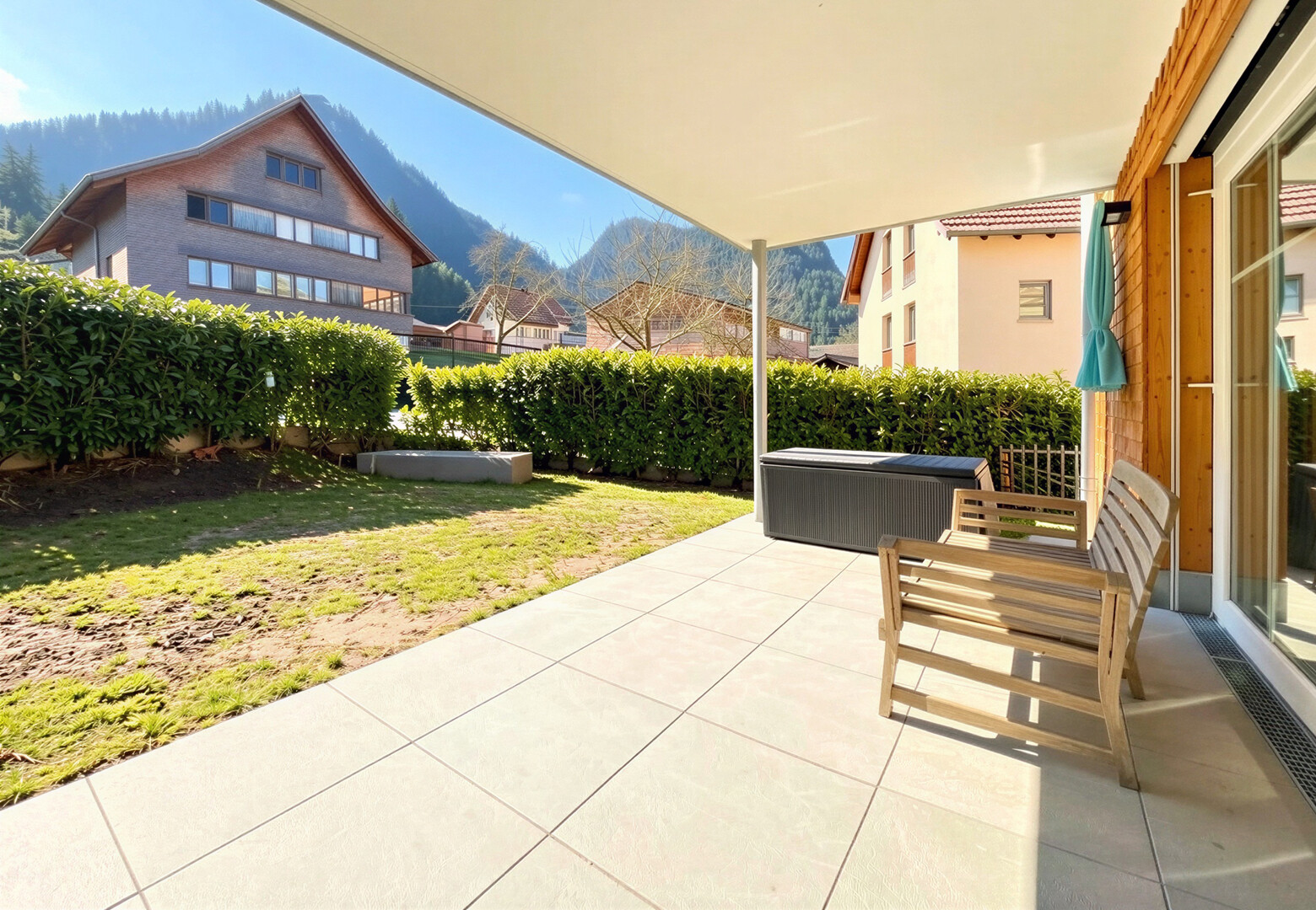 überdachte Südost-Terrasse mit nettem Garten