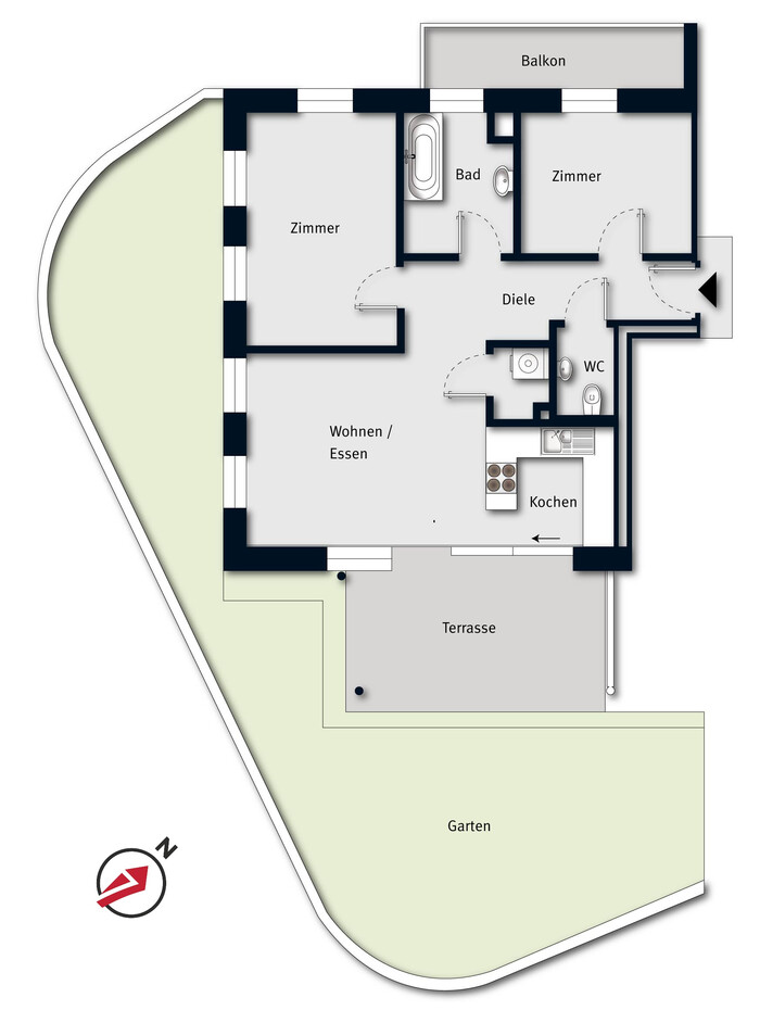 3 Zimmer | 66 m² Wohnfläche | 1 Balkon + 1 Terrasse | 50 m² Garten
